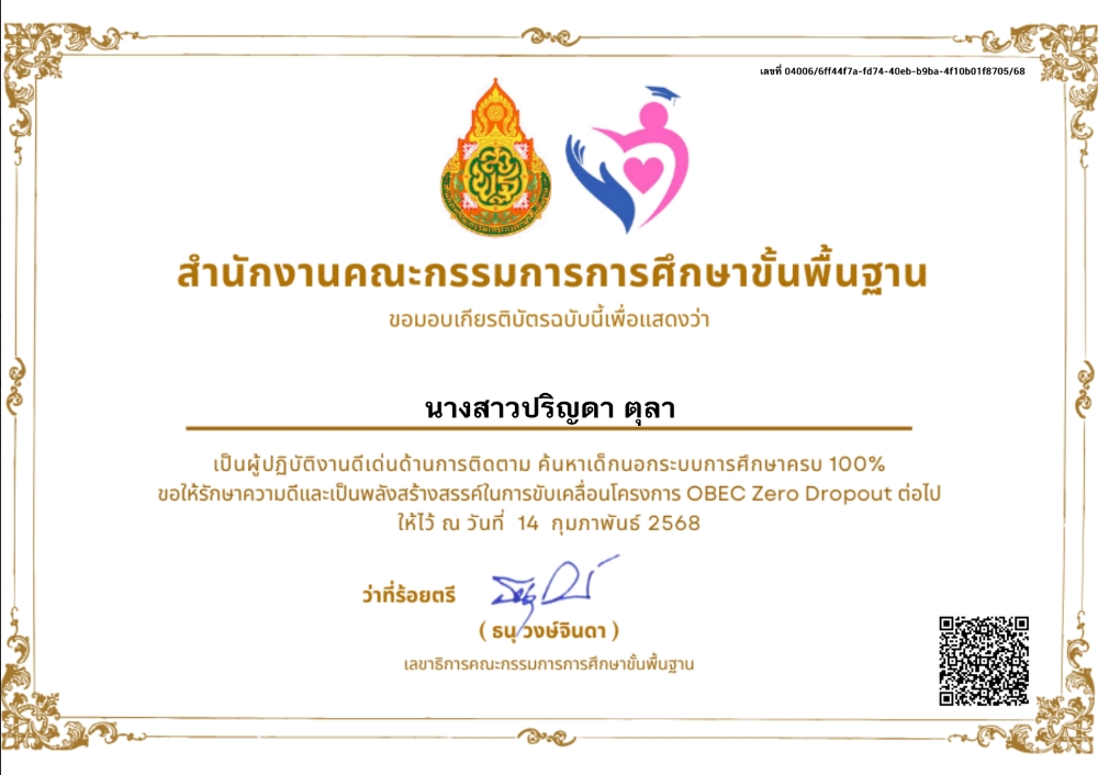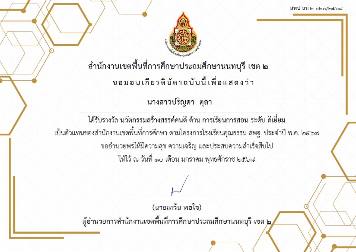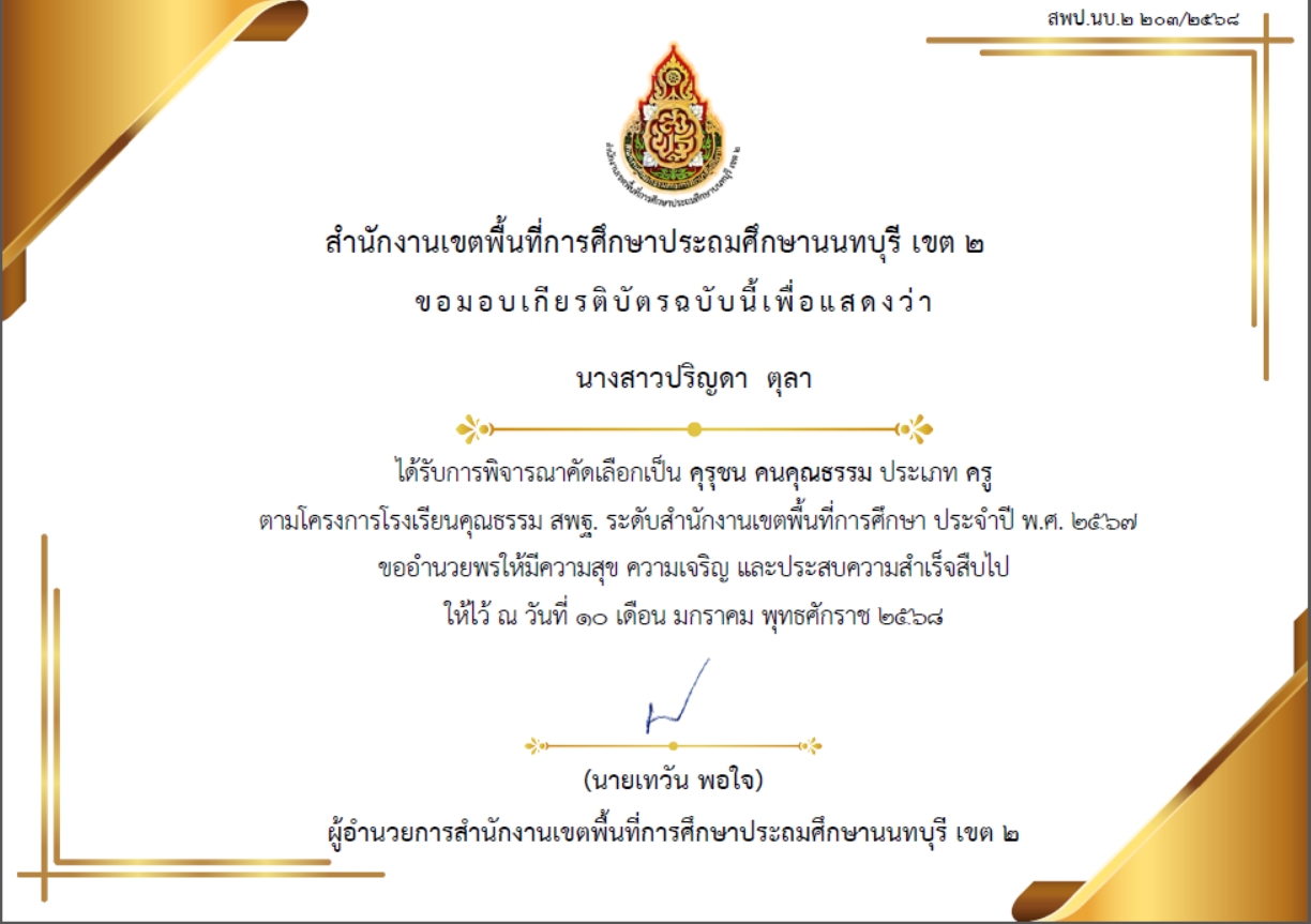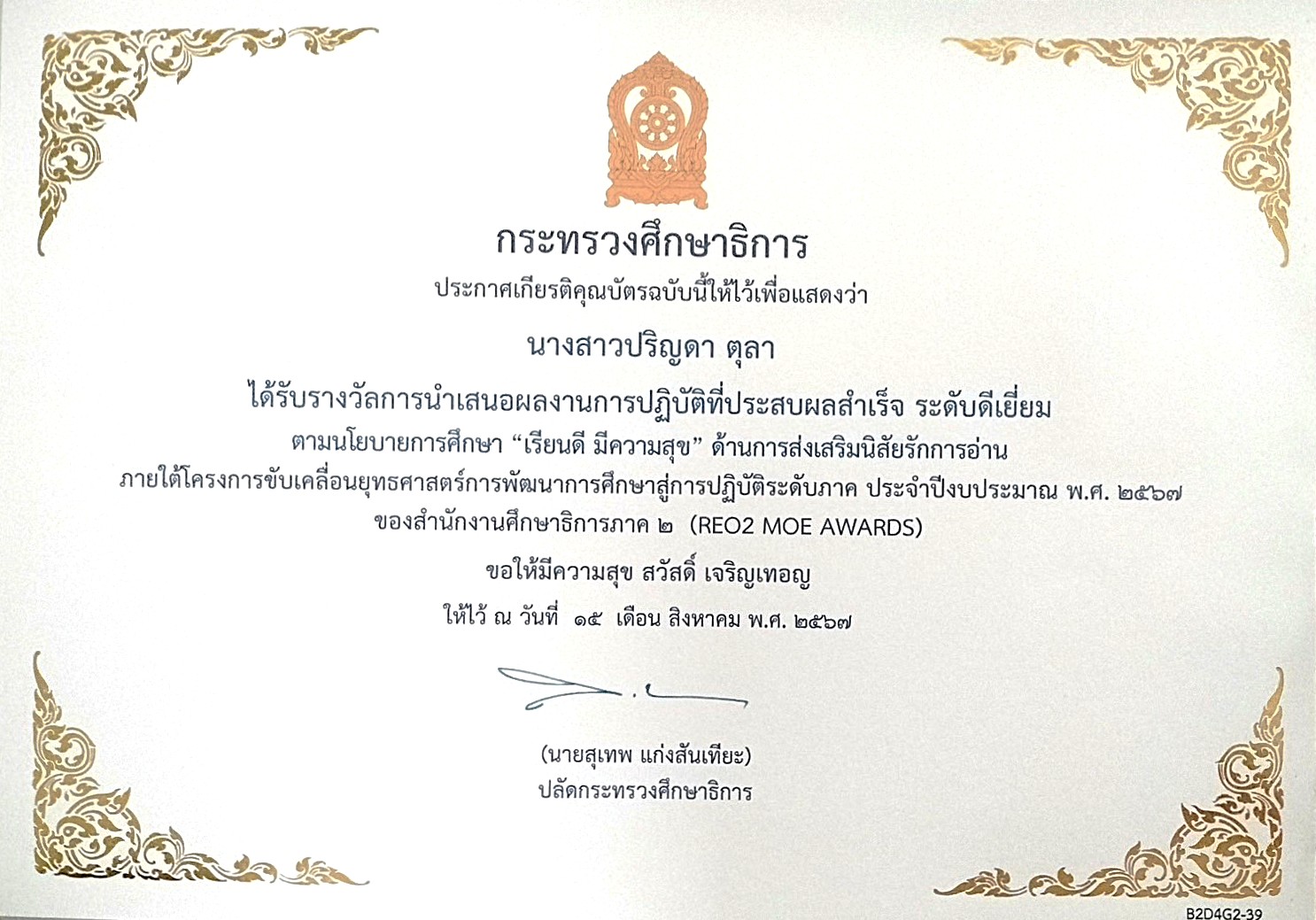 รางวัลการนำเสนอผลงานการปฎิบัติที่ประสบผลสำเร็จ ระดับดีเยี่ยม ตามนโยบายการศึกษา "เรียนดี มีความสุข" ด้านการส่งเสริมนิสัยรักการอ่าน |