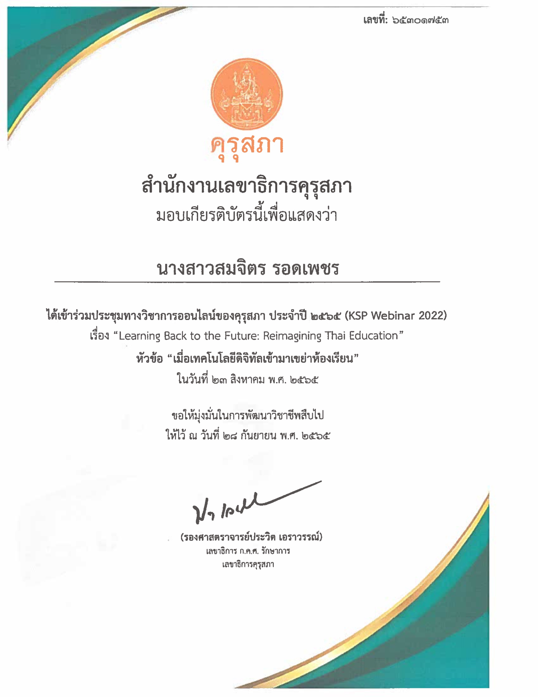 ชื่อผลงาน : ได้เข้าร่วมประชุมทางวิชาการออนไลน์ของคุรุสภา ประจำปี 2565 (KSP Webinar 2022) เรื่อง “Learning Back to the Future: Reimagining Thai Education” หัวข้อ “ เมื่อเทคโนโลยีดิจิทัลเข้ามาเขย่าห้องเรียน”