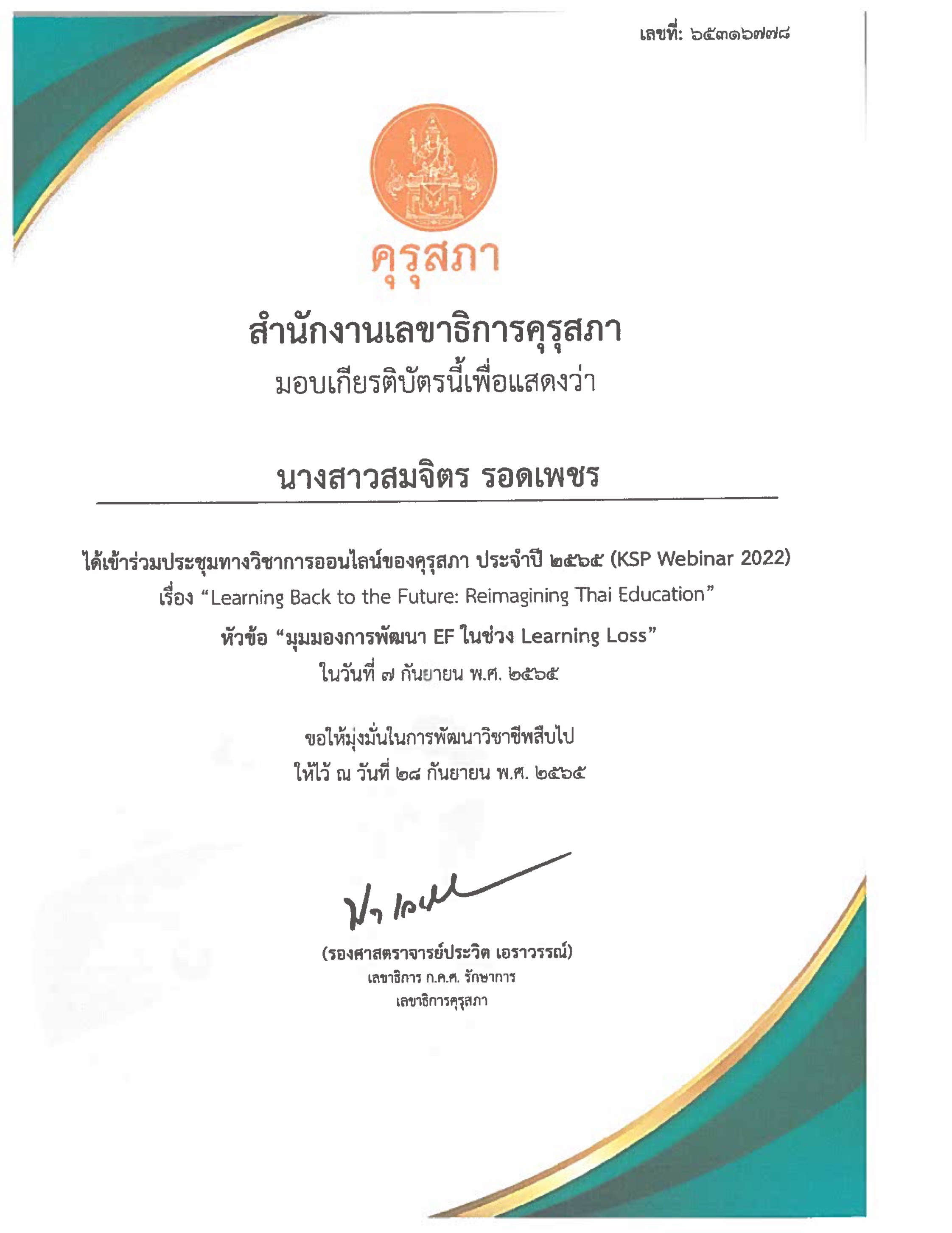 ชื่อผลงาน : ได้เข้าร่วมประชุมทางวิชาการออนไลน์ของคุรุสภา ประจำปี 2565 (KSP Webinar 2022) เรื่อง “Learning Back to the Future: Reimagining Thai Education” หัวข้อ “มุมมองการพัฒนา EF ในช่วง Learning Loss”