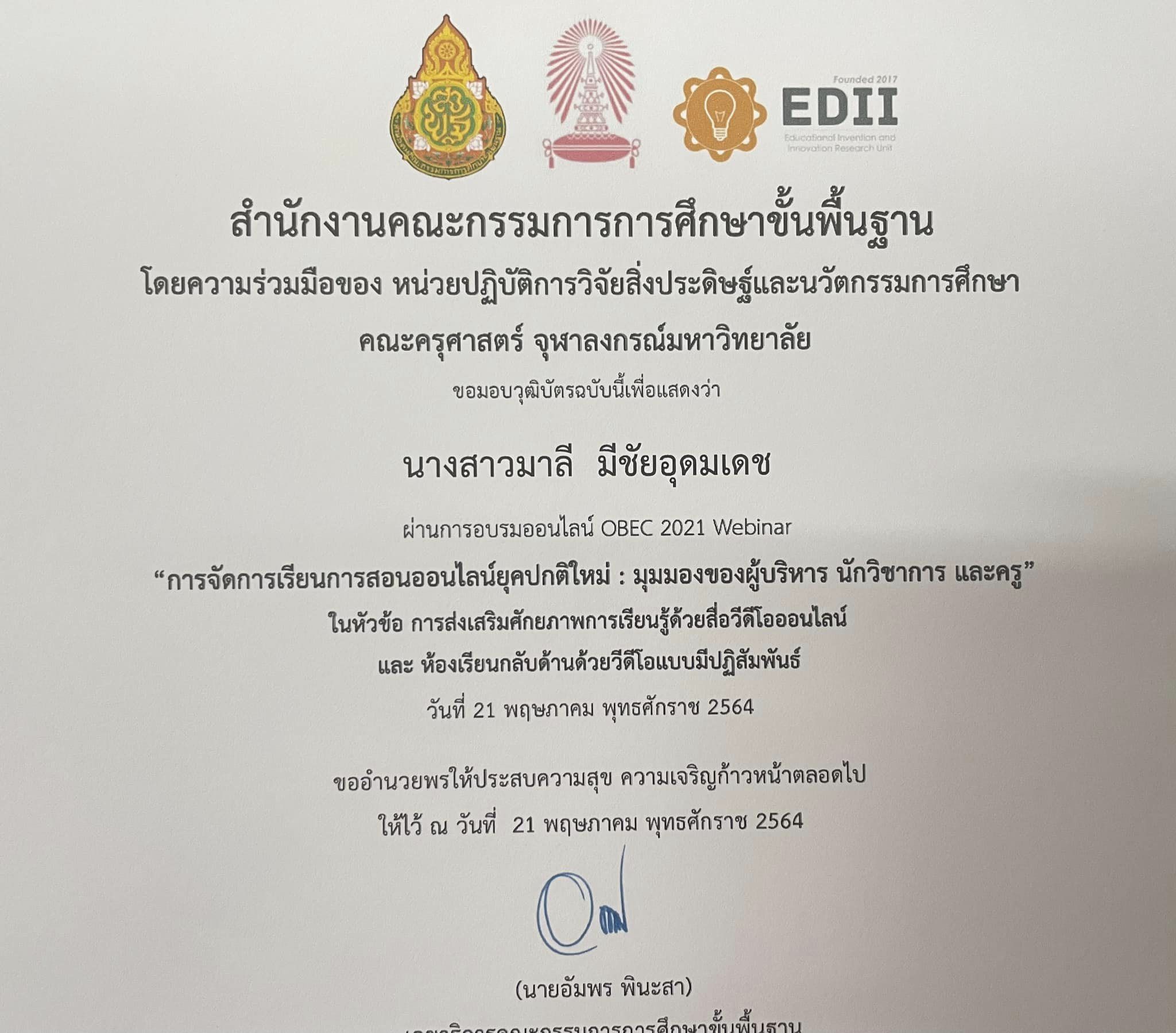 ชื่อผลงาน : การส่งเสริมศักยภาพการเรียนรู้ด้วยสื่อวิดีโอออนไลน์และห้องเรียนกลับด้านด้วยวีดีโอแบบมีปฏิสัมพันธื 21 พ.ค..2564