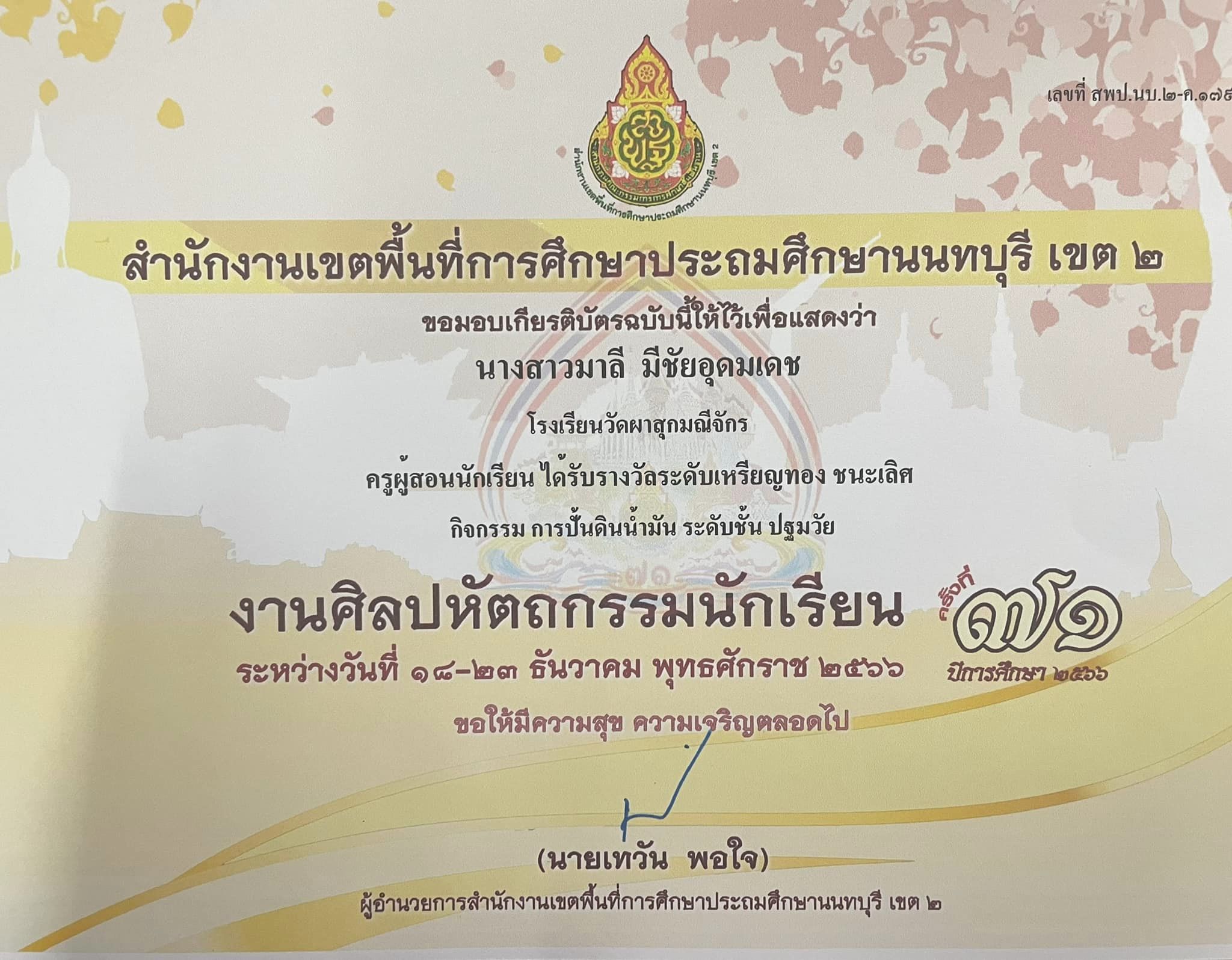 ชื่อผลงาน : ครูผู้สอนนักเรียน ได้รับรางวัลระดับเหรียญทอง ชนะเลิศ กิจกรรม การปั้นดินน้ำมัน ระดับปฐมวัย