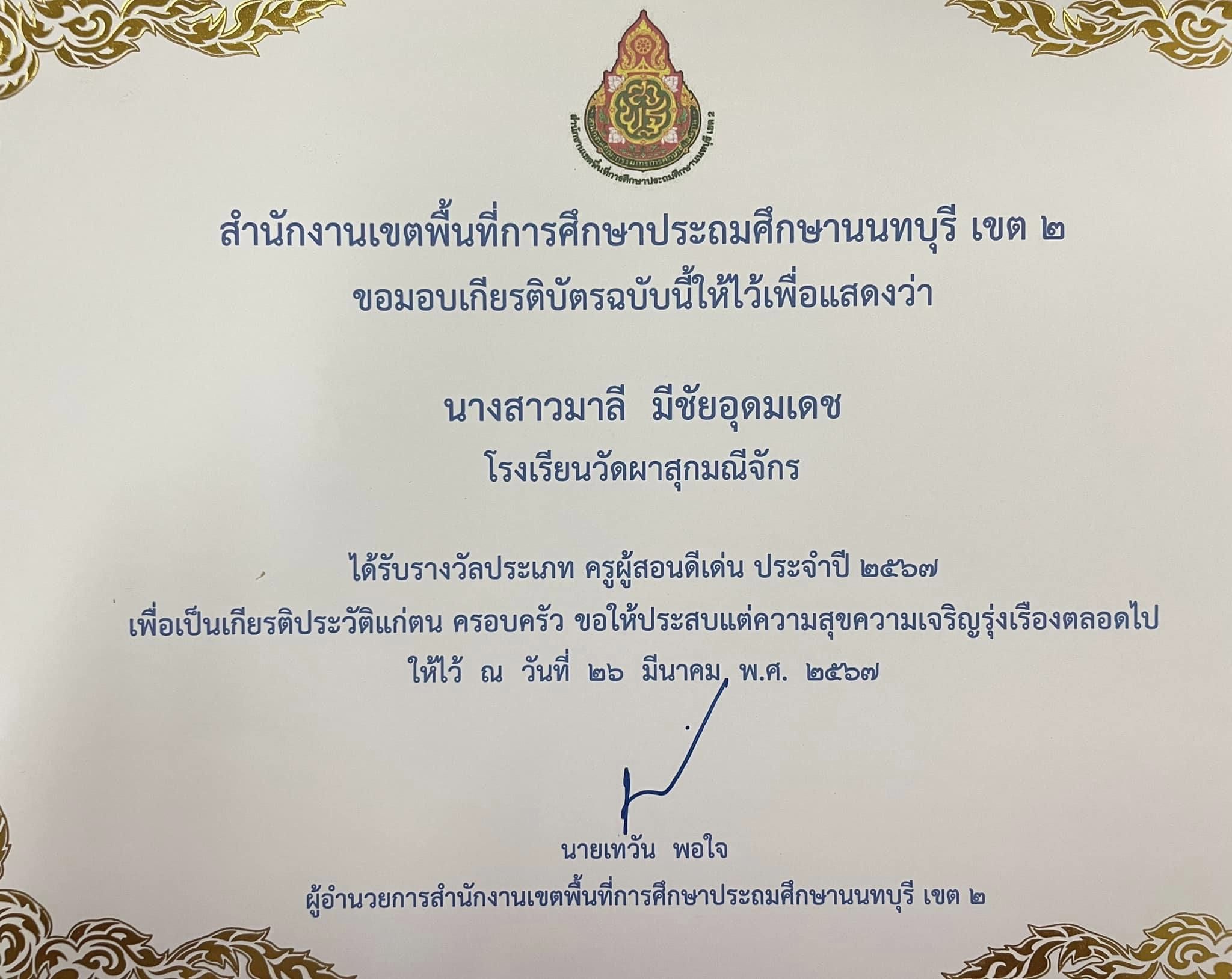 ชื่อผลงาน : รางวัลประเภท ครูผู้สอนดีเด่น ประจำปี 2567