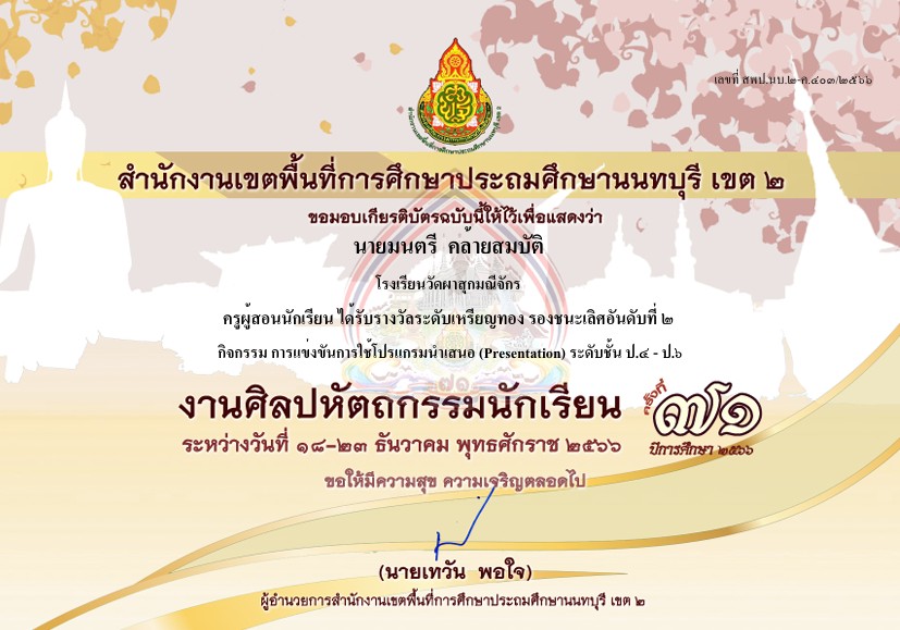 ชื่อผลงาน : ครูผู้สอนนักเรียนได้รับรางวัลเหรียญทอง รองชนะเลิศอันดับที่ 2 การแข่งขันการใช้โปรแกรมนำเสนอ (Presentation) ป.4-ป.6