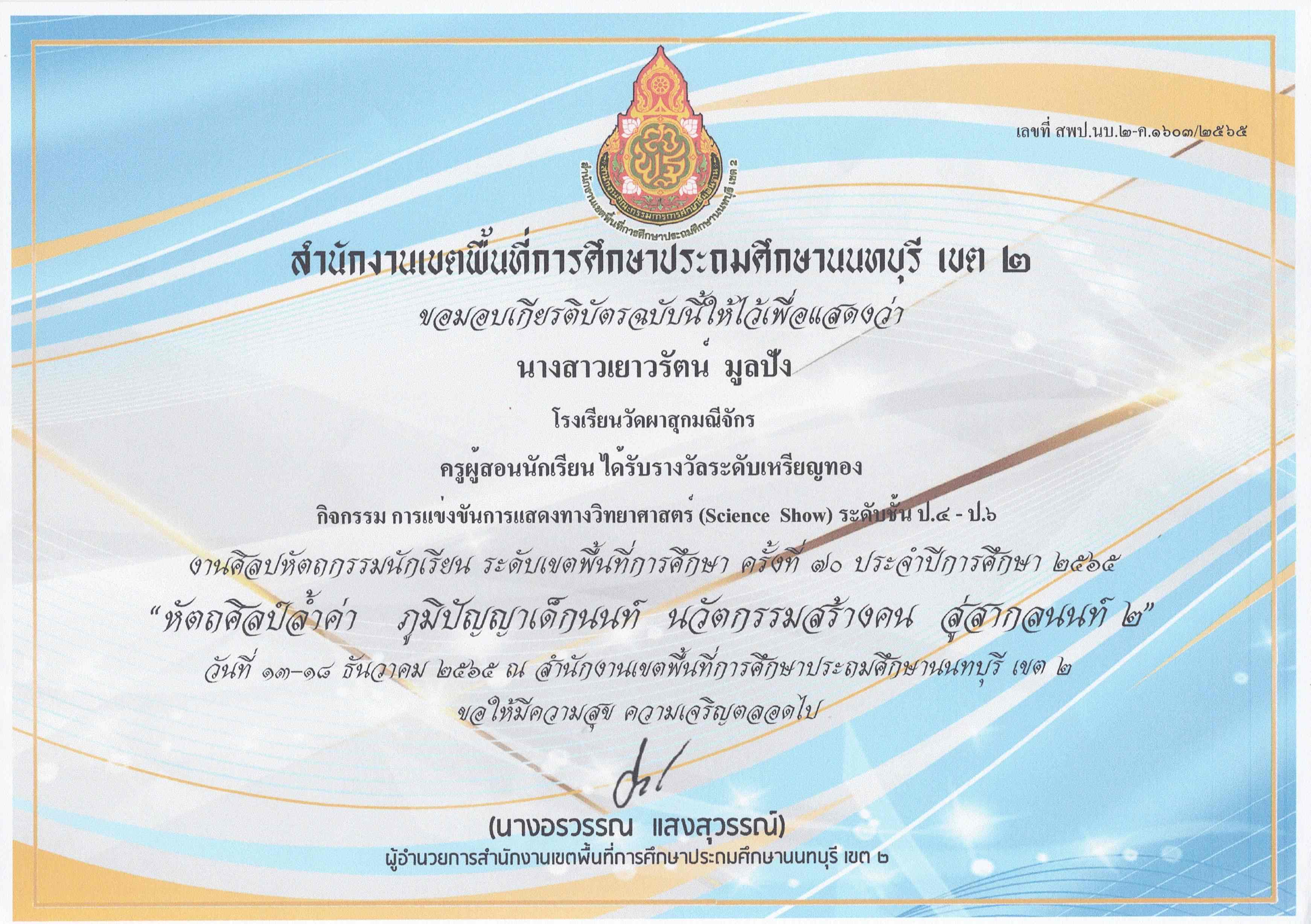 ชื่อผลงาน : ครูผู้ฝึกสอนนักเรียน ได้รับรางวัลระดับเหรียญทอง กิจกรรม การแข่งขันการแสดงวิทยาศาสตร์ งานศิลปหัตถกรรม ครั้งที่ ๗๐