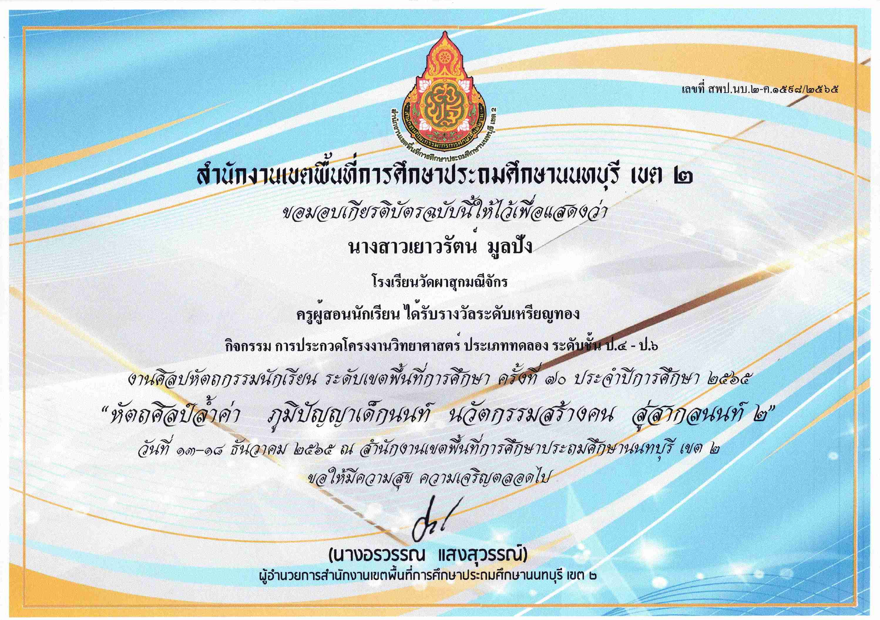 ชื่อผลงาน : ครูผู้ฝึกสอนนักเรียน ได้รับรางวัลระดับเหรียญทอง กิจกรรม การประกวดโครงงานวิทยาศาสตร์ ประเภททดลอง งานศิลปหัตถกรรม ครั้งที่ ๗๐