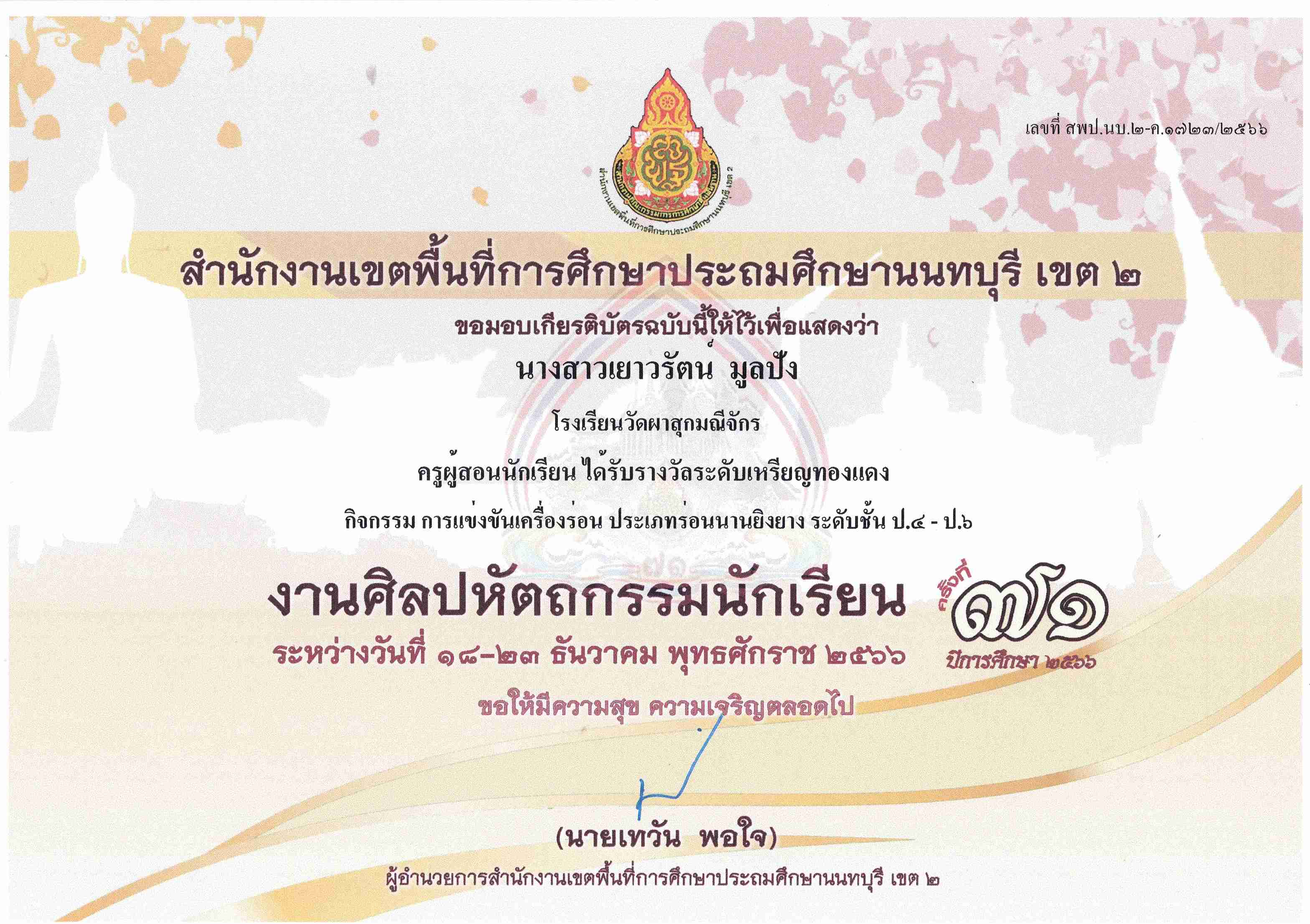 ชื่อผลงาน : ครูผู้ฝึกสอนนักเรียน ได้รับรางวัลระดับเหรียญทองแดง กิจกรรม แข่งขันเครื่องร่อน ประเภทร่อนนานยิงยาง งานศิลปหัตถกรรม ครั้งที่ ๗๑