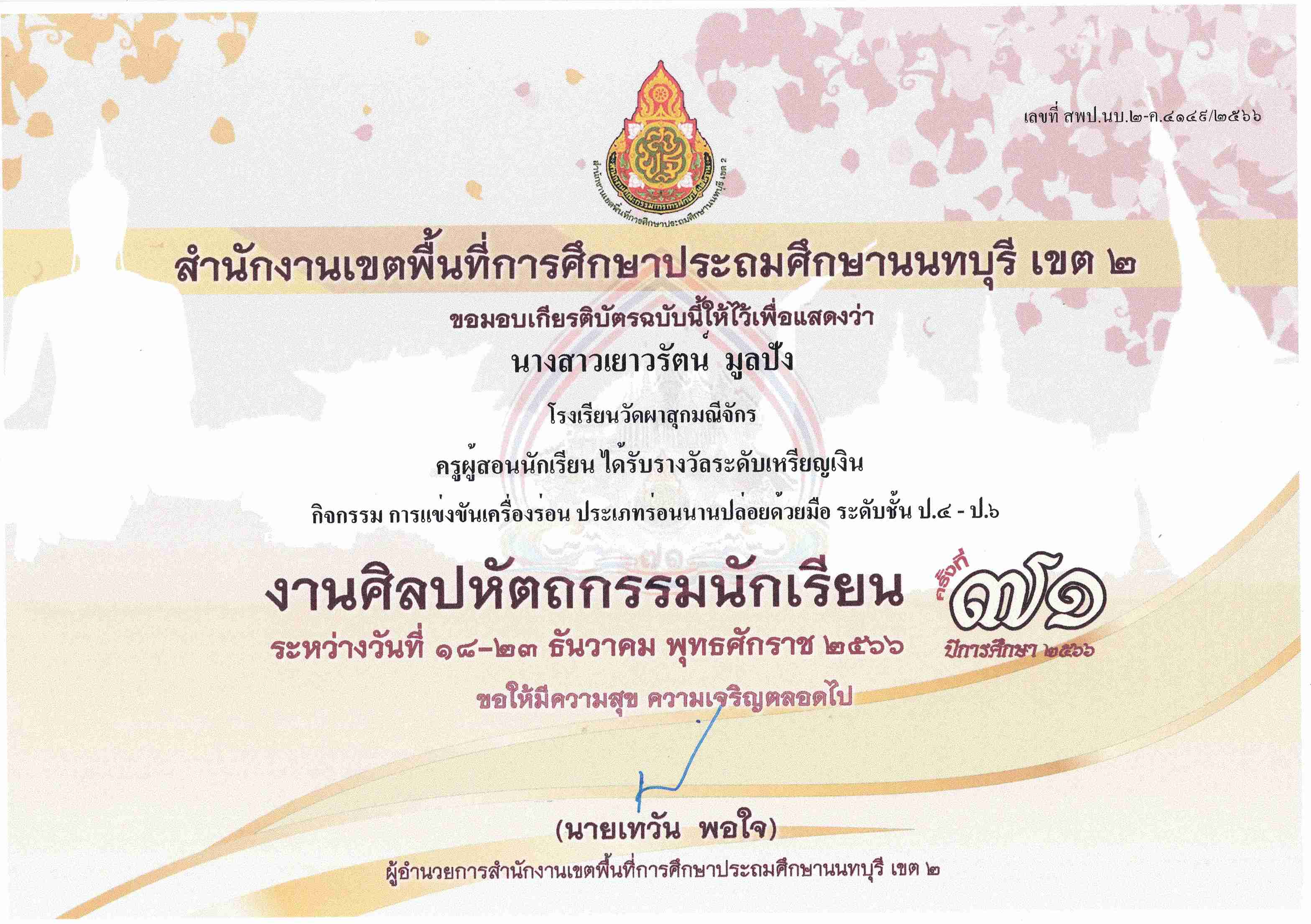 ชื่อผลงาน : ครูผู้ฝึกสอนนักเรียน ได้รับรางวัลระดับเหรียญเงิน กิจกรรม แข่งขันเครื่องร่อน ประเภทร่อนนานปล่อยด้วยมือ งานศิลปหัตถกรรม ครั้งที่ ๗๑