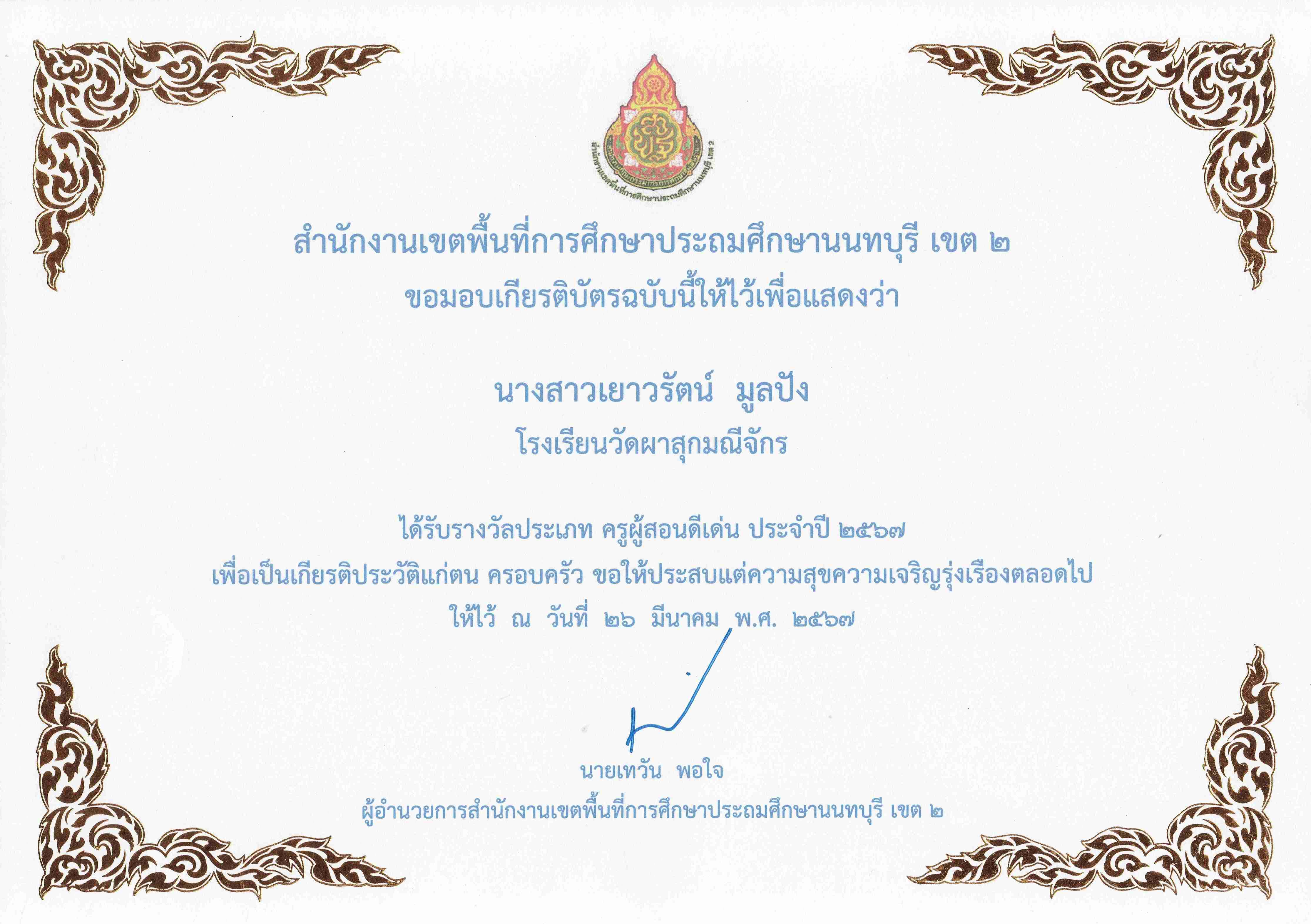 ชื่อผลงาน : ได้รับรางวัลประเภท ครูผู้สอนดีเด่น ประจำปี ๒๕๖๗