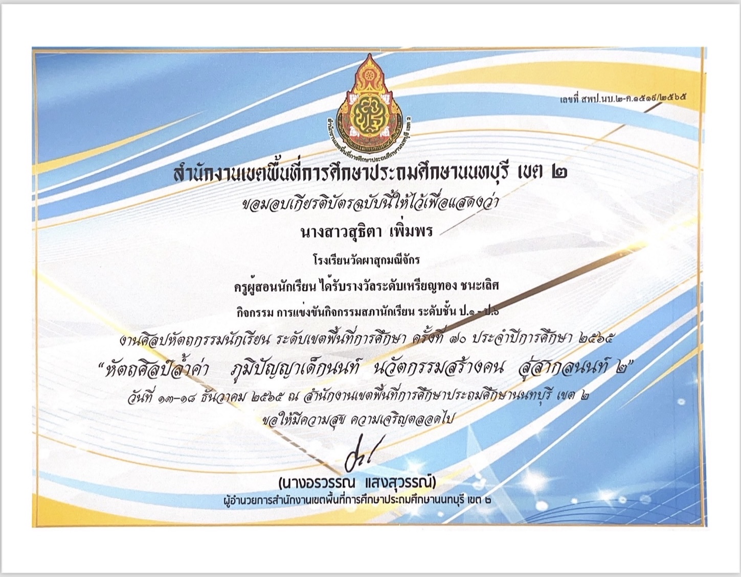 ชื่อผลงาน : ครูผู้สอนนักเรียน ได้รับรางวัลเหรียญทอง ชนะเลิศ การแข่งขันกิจกรรมสภานักเรียน ระดับชั้นป.๑-ป.๖ งานศิลปหัตกรรมนักเรียนครังที่ ๗๐ ประจำปีการศึกษา ๒๕๖๕