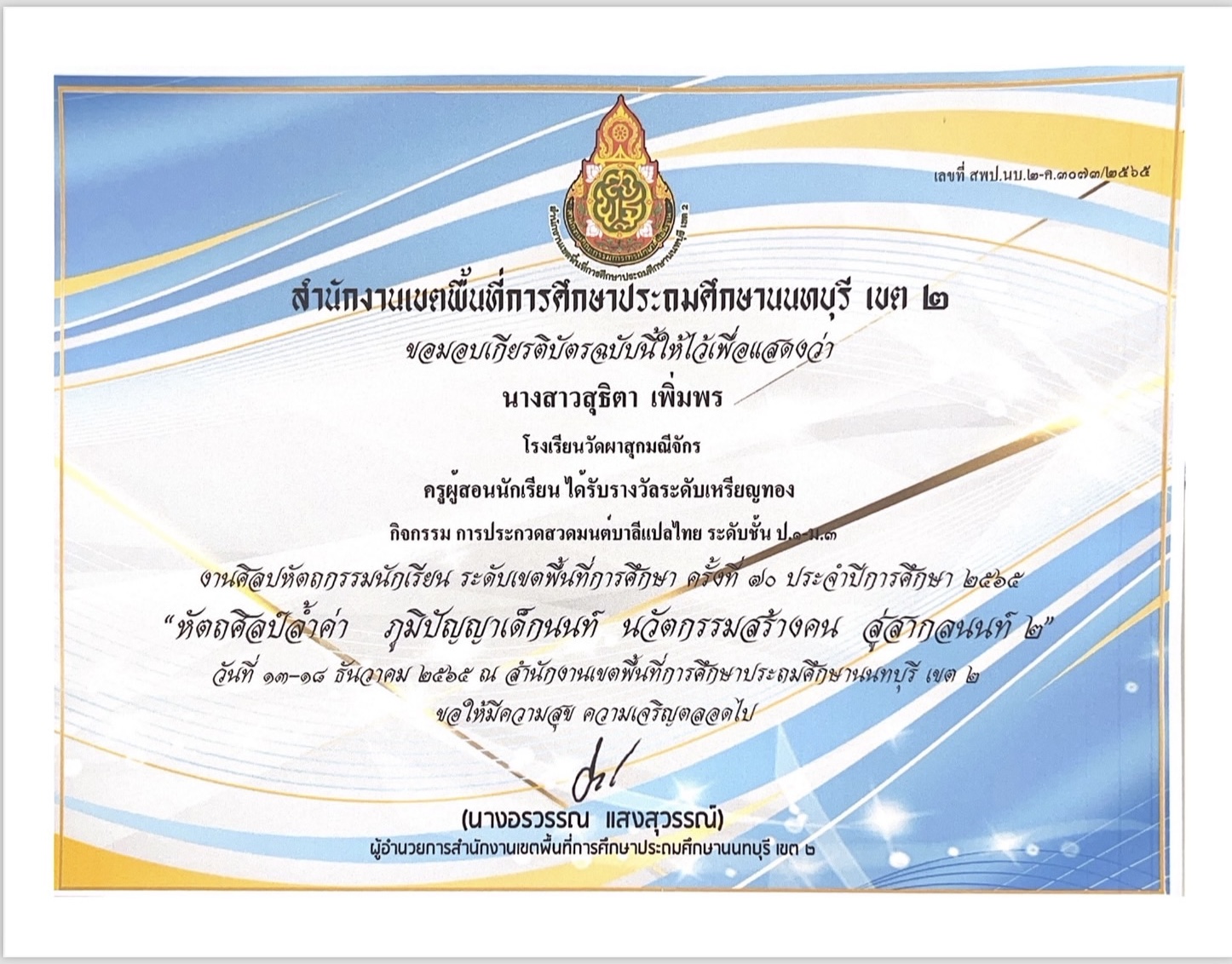 ชื่อผลงาน : ครูผู้สอนนักเรียน ได้รับรางวัลเหรียญทอง การประกวดสวดมนต์บาลีแปลไทย ป.๑-ม.๓ งานศิลปหัตกรรมนักเรียนครังที่ ๗๐ ประจำปีการศึกษา ๒๕๖๕