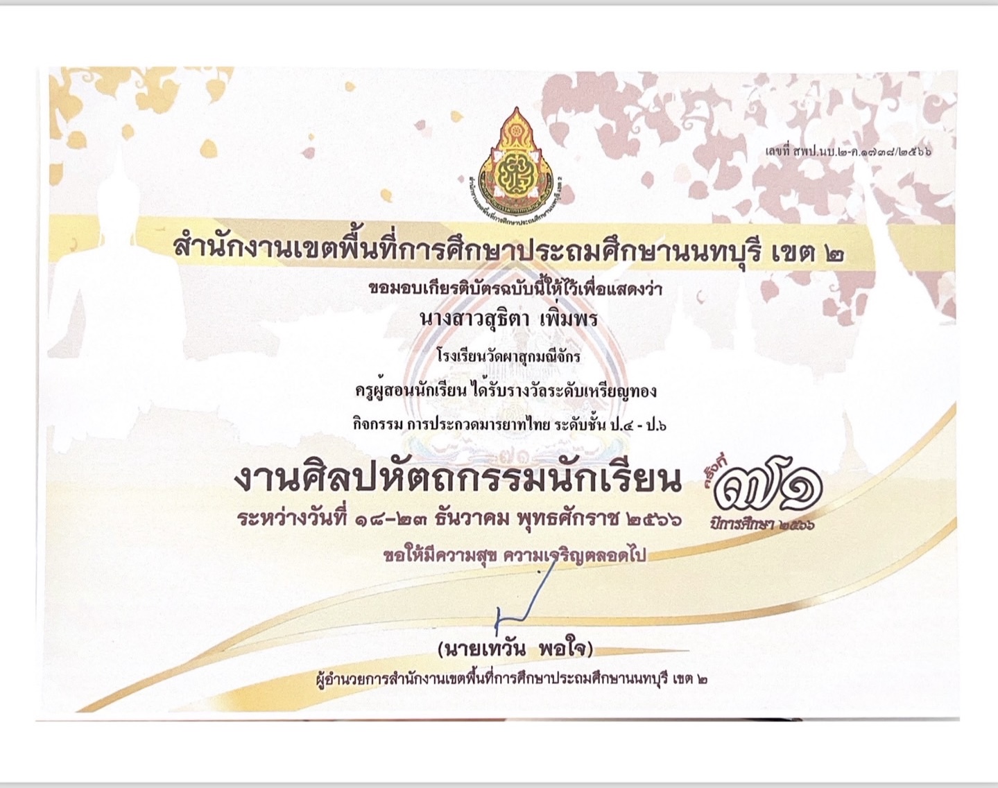 ชื่อผลงาน : ครูผู้สอนนักเรียน ได้รับรางวัลเหรียญทอง กิจกรรมการประกวดมารยาทไทย ป.๔-ป.๖ งานศิลปหัตกรรมนักเรียนครังที่ ๗๑ ประจำปีการศึกษา ๒๕๖๖