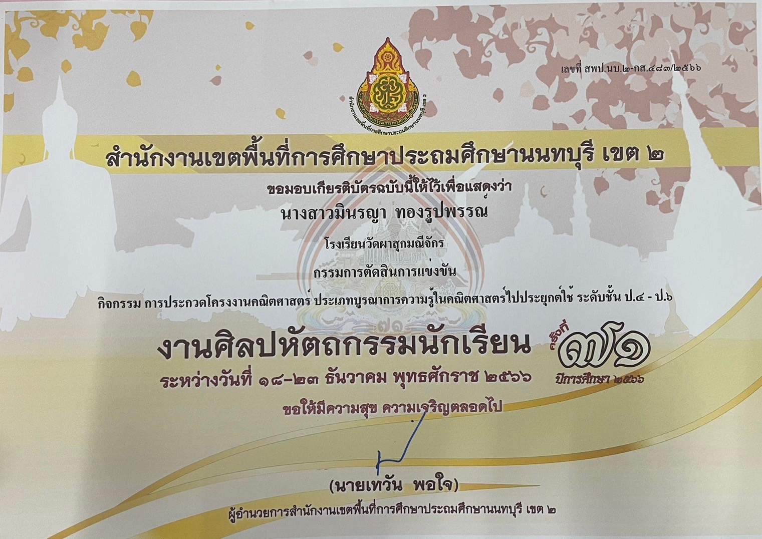 ชื่อผลงาน : กรรมการตัดสินการแข่งขันกิจกรรมการประกวดโครงงานคณิตศาสตร์ประเภทบูรณาการความรู้ในคณิตศาสตร์ไปประยุกต์ใช้ระดับชั้น ป. 4 -ป. 6