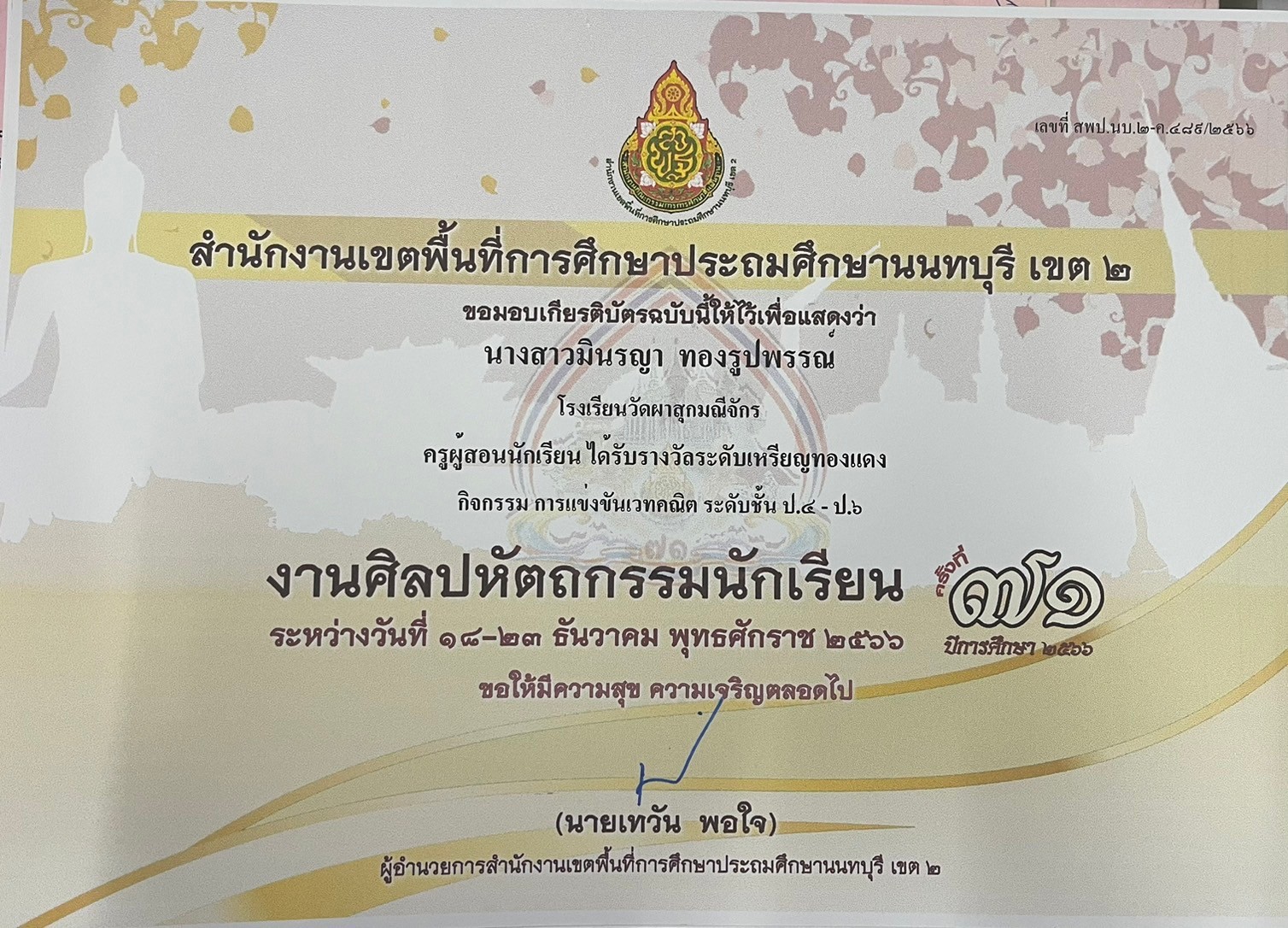 ชื่อผลงาน : ครูผู้สอนนักเรียนได้รับรางวัลระดับเหรียญทองแดงกิจกรรมการแข่งขันเวทคณิตระดับชั้น ป. 4 - ป. 6 งานศิลปหัตถกรรมนักเรียนครั้งที่ 71