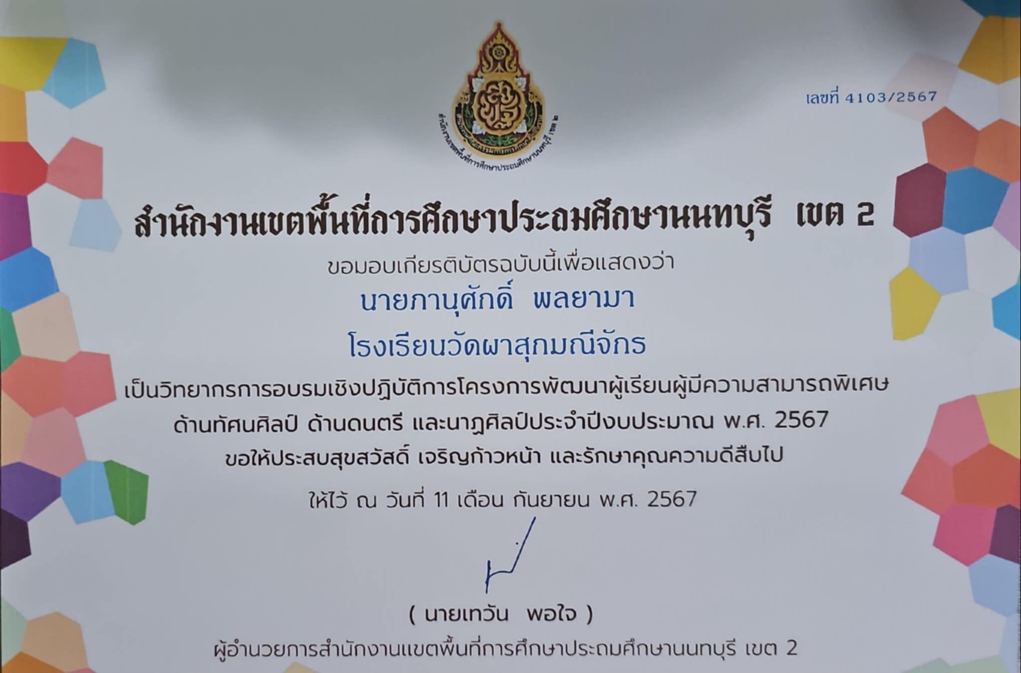 ชื่อผลงาน : เป็นวิทยากรการอบรบเชิงปฎิบัติการโครงการพัฒนาผู้เรียนผู้มีความสามารถพิเศษ ด้านทัศนศิลป์ ด้านดนตรี และนาฎศิลป์ประจำปีงบประมาณ พ.ศ.2567 ให้กับสำนักงานเขตพื้นที่การศึกษาประถมศึกษานนทบุรี เขต 2