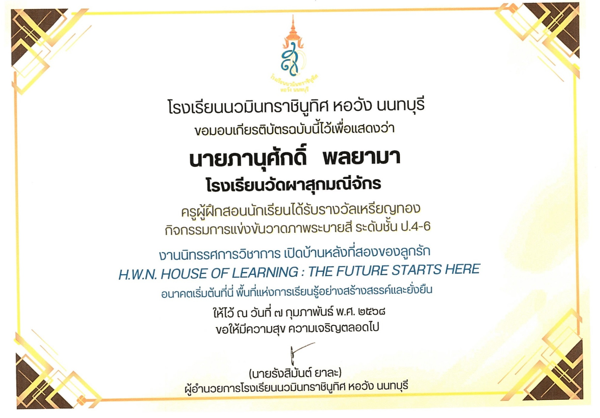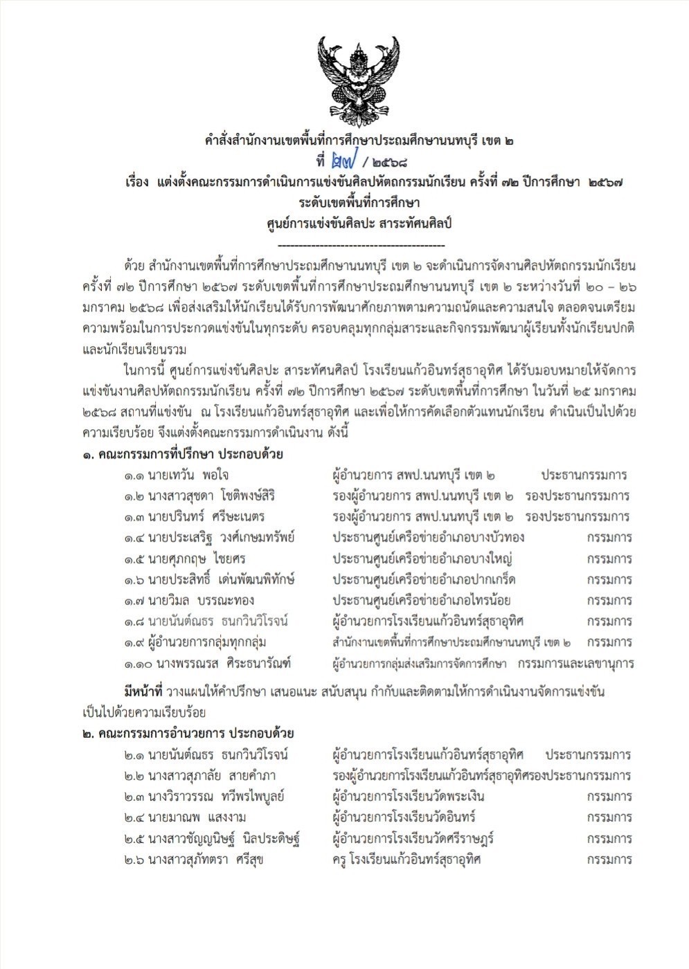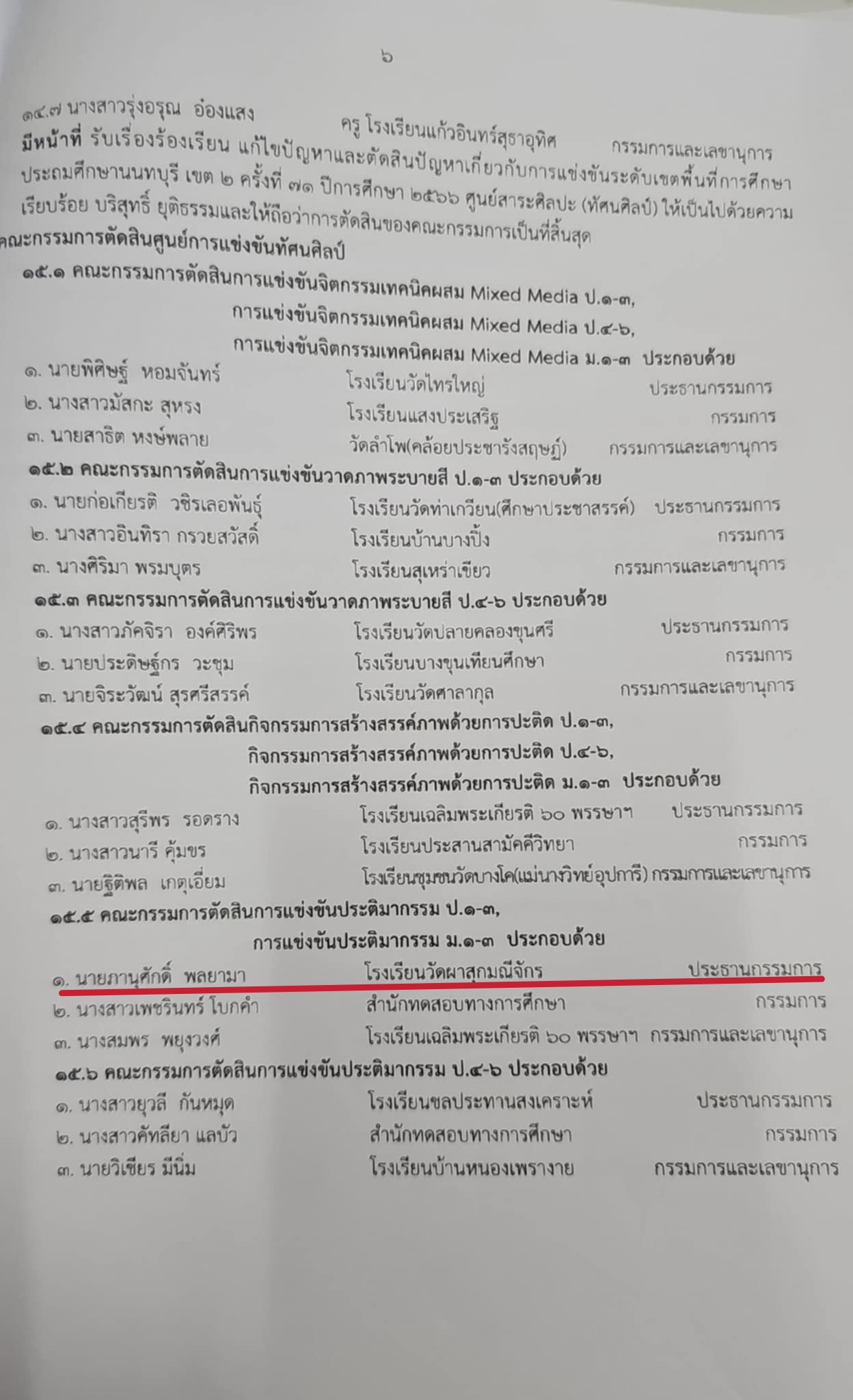 กรรมการตัดสิน 4 รายการ (การแข่งขันศิลปหัตถกรรมนักเรียนครั้งที่ 72) 1.การแข่งขันจิตรกรรมเทคนิคผสม Mixed Midia ม.1-3 2.การแข่งขันวาดภาพระบายสี ม.1-3 3.การแข่งขันเขียนภาพไทยประเพณี ม.1-3 4.การแข่งขันวาดเส้น DRAWING ม.1-3 |