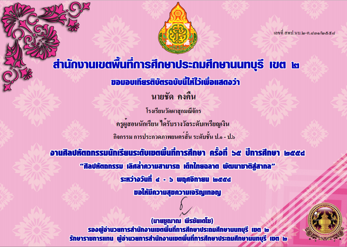 ครูผู้สอนนักเรียนได้รับรางวัลระดับเหรียญเงิน กิจกรรมการประกวดภาพยนตร์สั้น ระดับชั้น ป.๑ - ป.๖ ระดับ สพป.นนทบุรี เขต ๒ ปี พ.ศ.๒๕๕๘