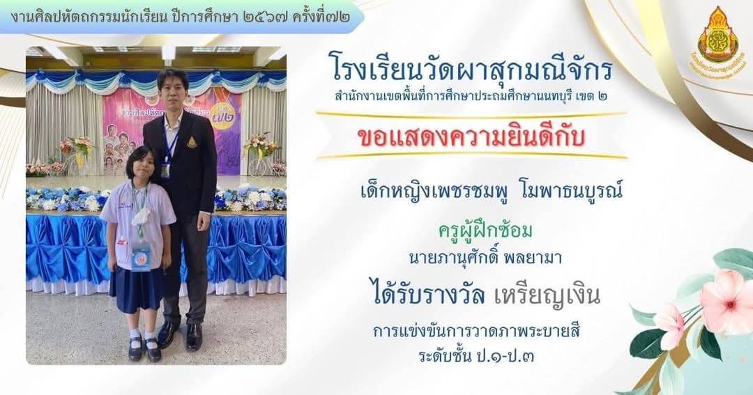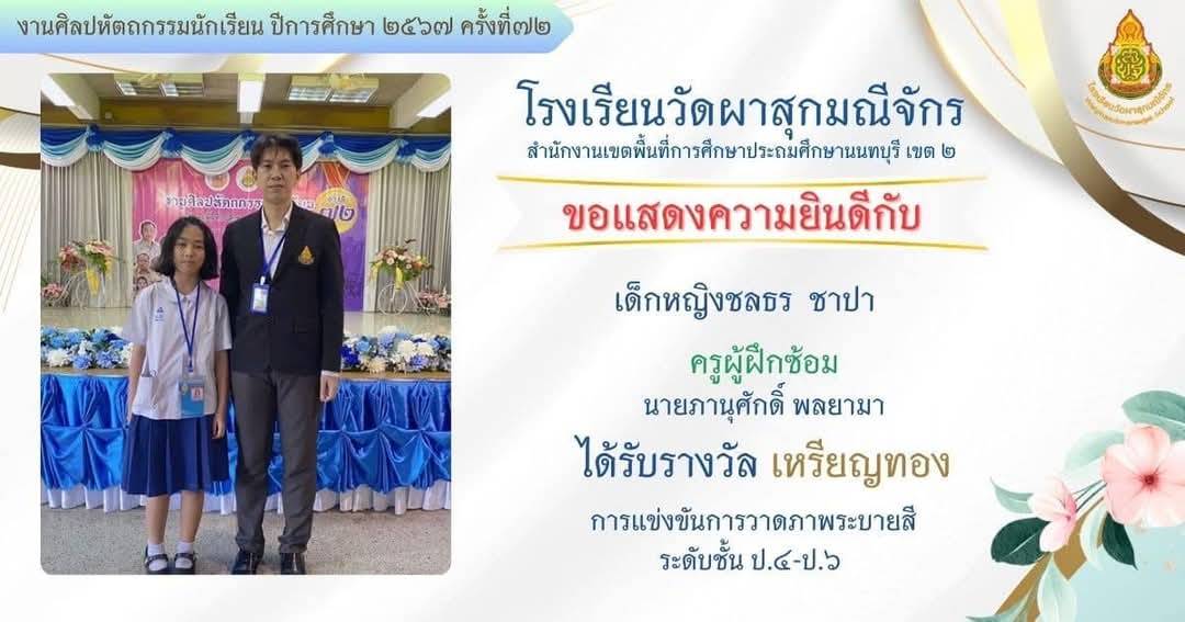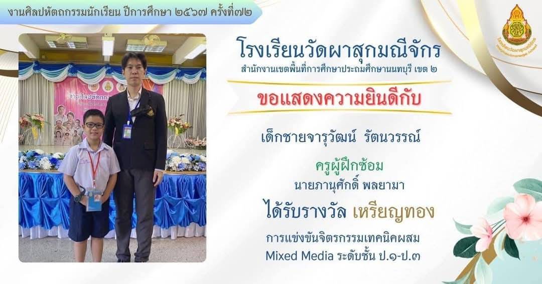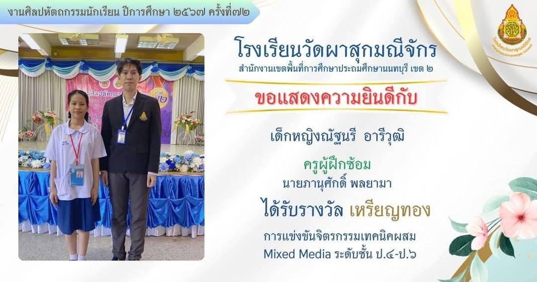 ครูผู้สอนนักเรียน ได้รับรางวัลระดับเหรียญทอง รองชนะเลิศอันดับที่ 1 กิจกรรมอัจฉริยภาพทางภาษาไทย งานนิทรรศการวิชาการ Horwang Non House of Learning เปิดบ้านหลังที่สองของลูกรัก ปีการศึกษา 2566 |