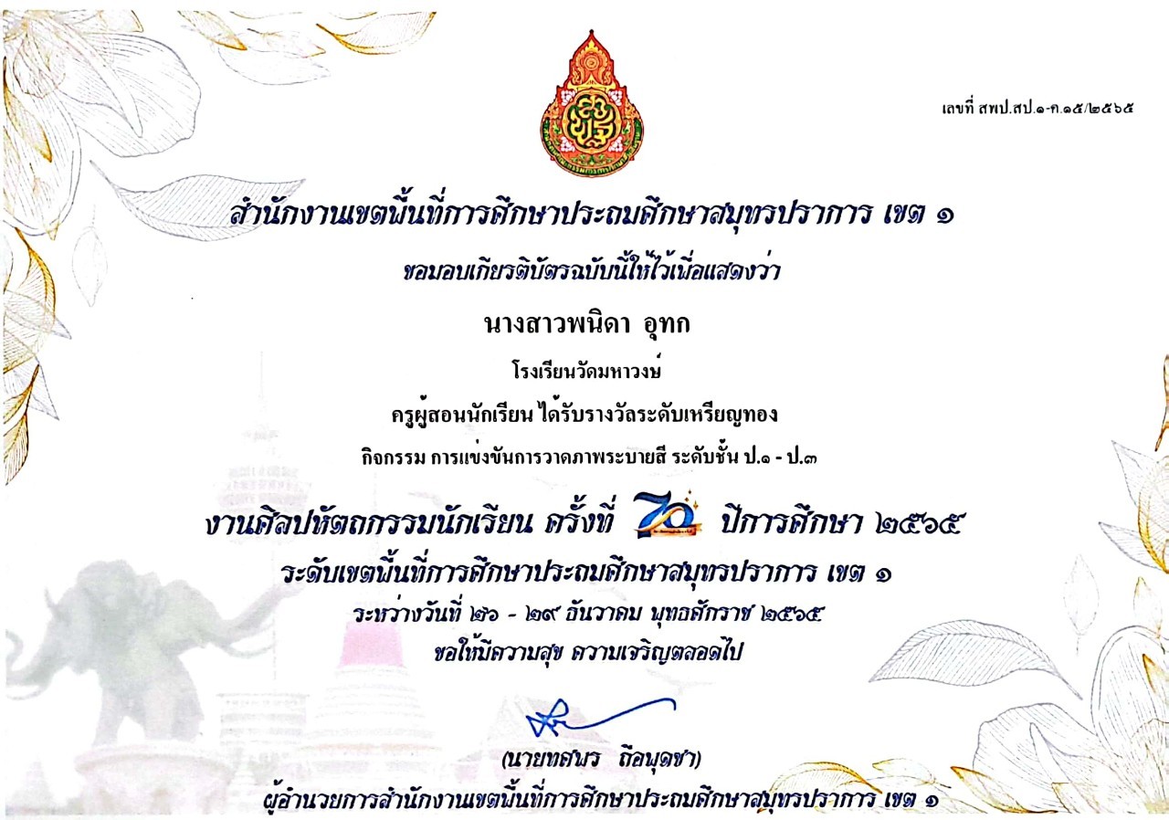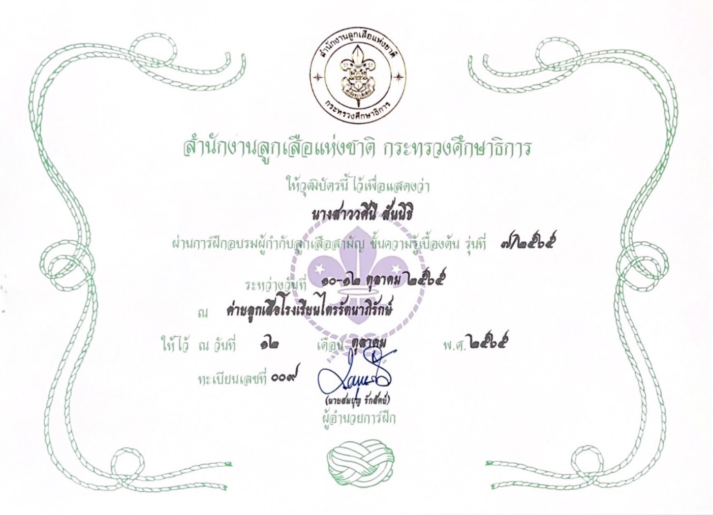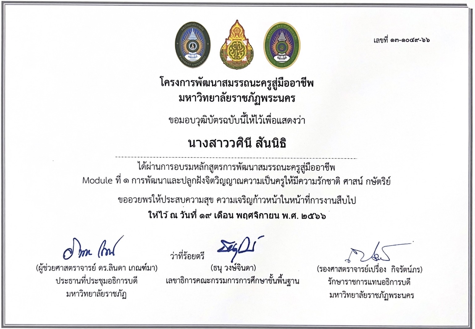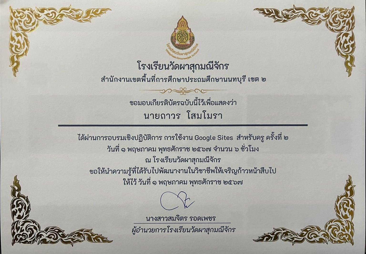 ได้ผ่านการอบรมเชิงปฏิบัติการ การใช้งาน Google Sites สำหรับครู ครั้งที่ ๒ วันที่ ๑ พฤษภาคม พุทธศักราช ๒๕๖๗ จำนวน ๖ ชั่วโมง ณ โรงเรียนวัดผาสุกมณีจักร |