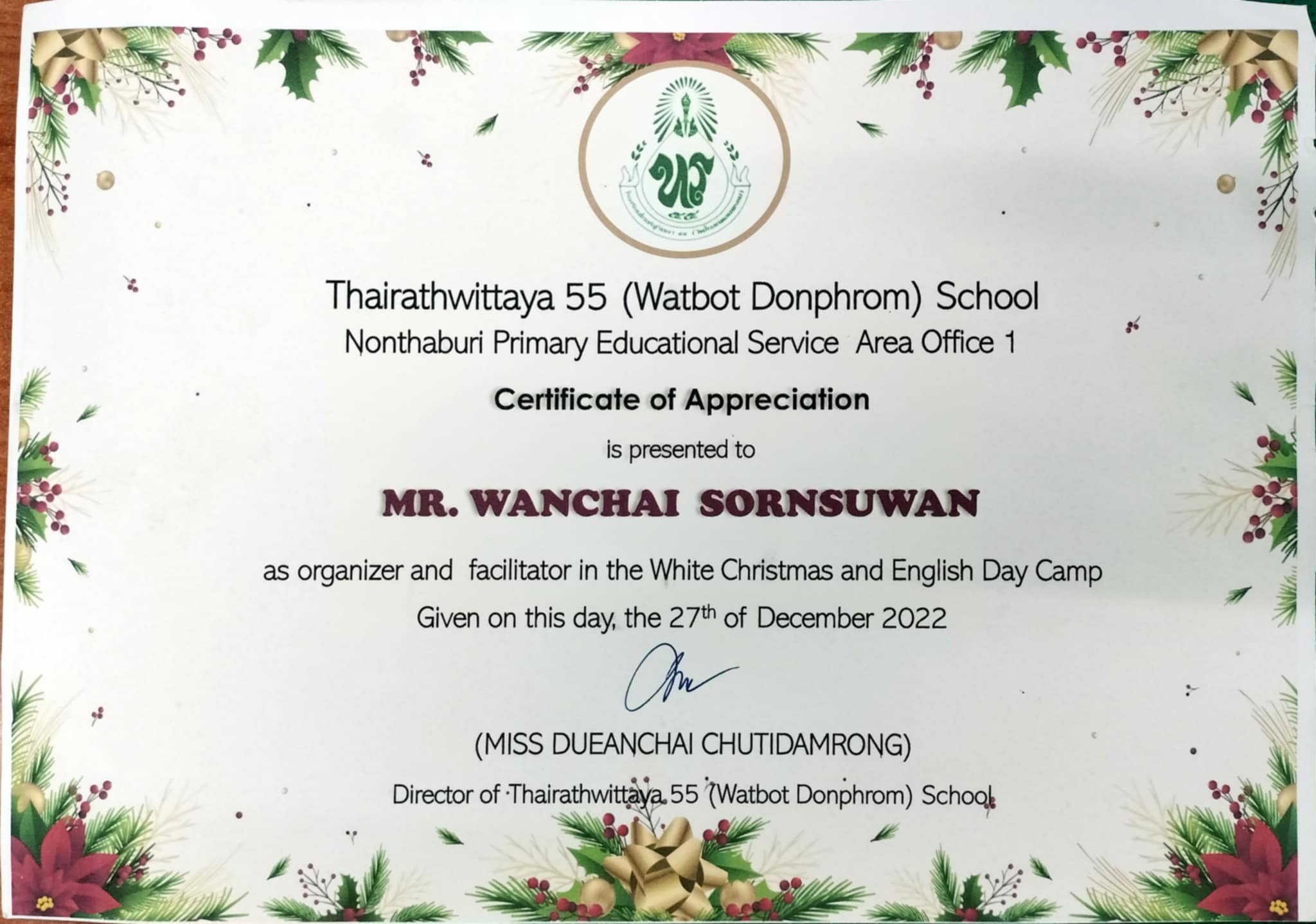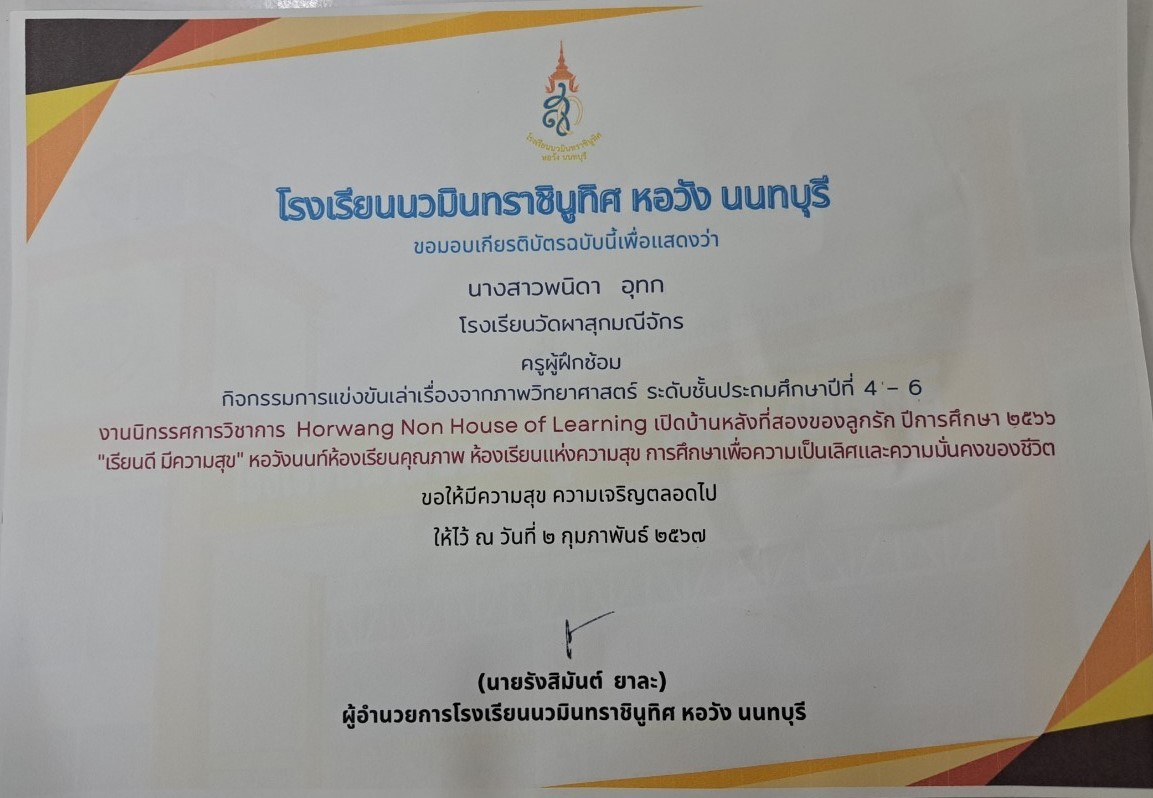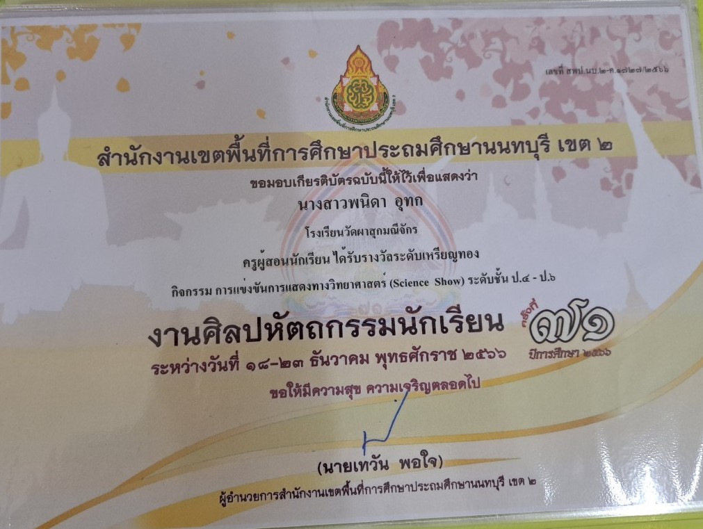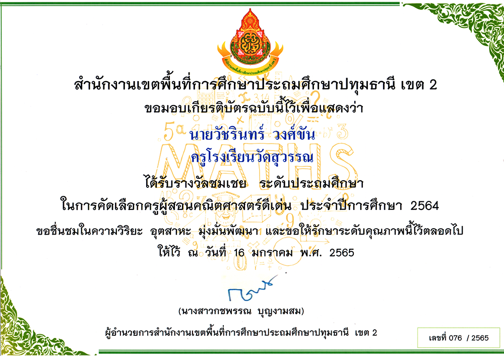 ได้รับรางวัลชมเชย ระดับประถมศึกษษ ในการคัดเลือกครูผู้สอนคณิตศาสตร์ดีเด่น ประจำปีการศึกษา 2564