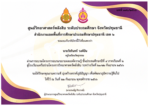 ผ่านการอบรมโครงการอบรมขยายผลองค์ความรู้ ชั้นประถมศึกษาปีที่ 4 ภาคเรียนที่ 2 โครงการวิทยาศาสตร์พลังสิบ