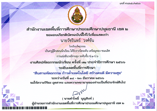 ได้รับรางวัลระดับ เหรียญทอง ชนะเลิศ การแข่งขันวงอังกะลุง ระดับชั้น ป.1-ป.6 งานศิลปหัตถกรรมนักเรียน ครั้งที่ 71