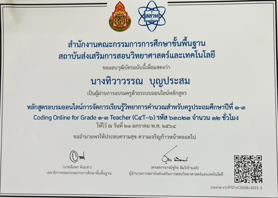 ชื่อผลงาน : หลักสูตรอบรมออนไลน์การจัดการเรียนรู้วิทยาการคำนวณสำหรับครูประถมศึกษาปีที่ 1-3
