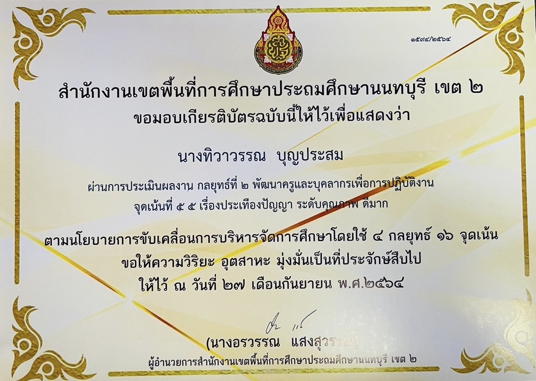 ชื่อผลงาน : ผ่านการประเมินผลงาน กลยุทธ์ที่ 2 พัฒนาครูและบุคลากรเพื่อการปฏิบัติงาน จุดเน้นที่ 5 5 เรื่องประเทืองปัญญา ระดับคุณภาพ ดีมาก