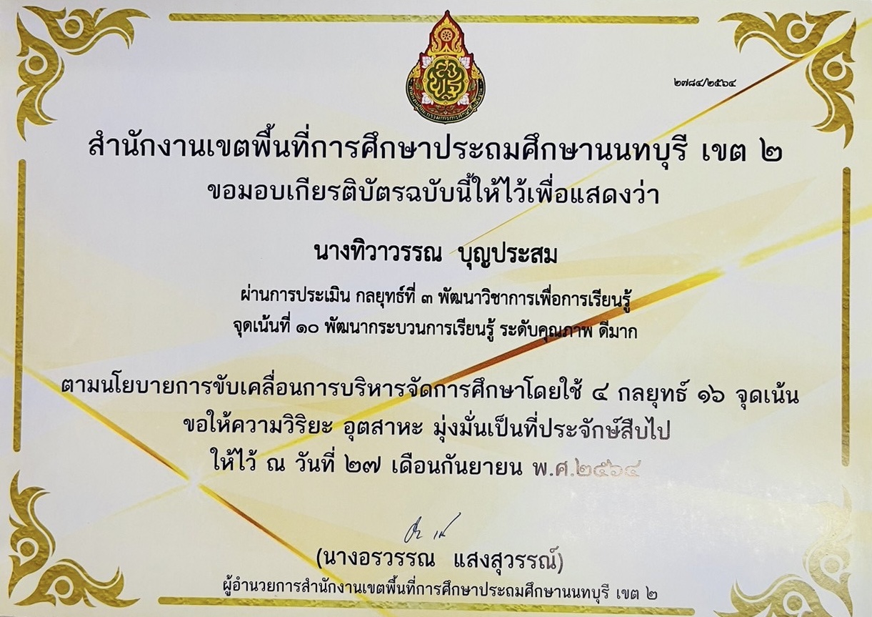ชื่อผลงาน : ผ่านการประเมินกลยุทธ์ที่ 3 พัฒนาวิชาการเพื่อการเรียนรู้ จุดเน้นที่ 10 พัฒนากระบวนการการเรียนรู้ระดับคุณภาพดีมาก