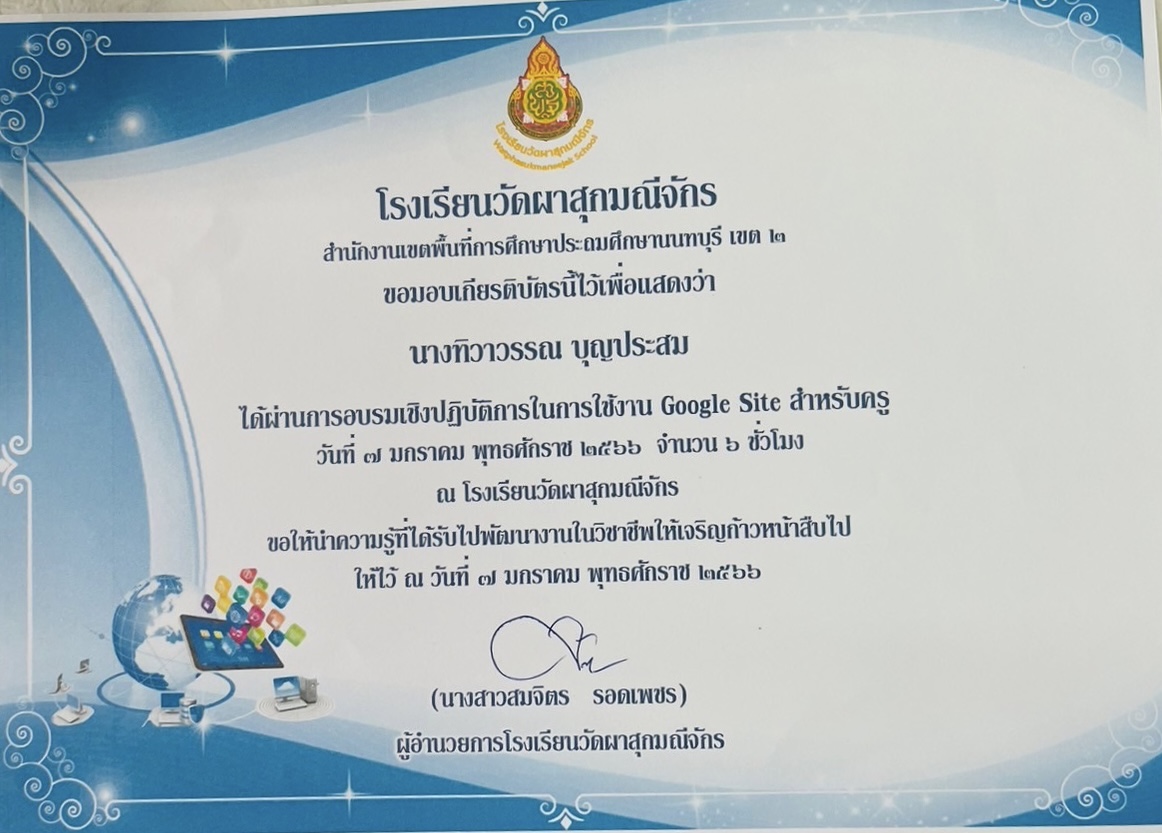 ชื่อผลงาน : ได้ผ่านการอบรมเชิงปฏิบัติการในการใช้งาน Google Site สำหรับครู