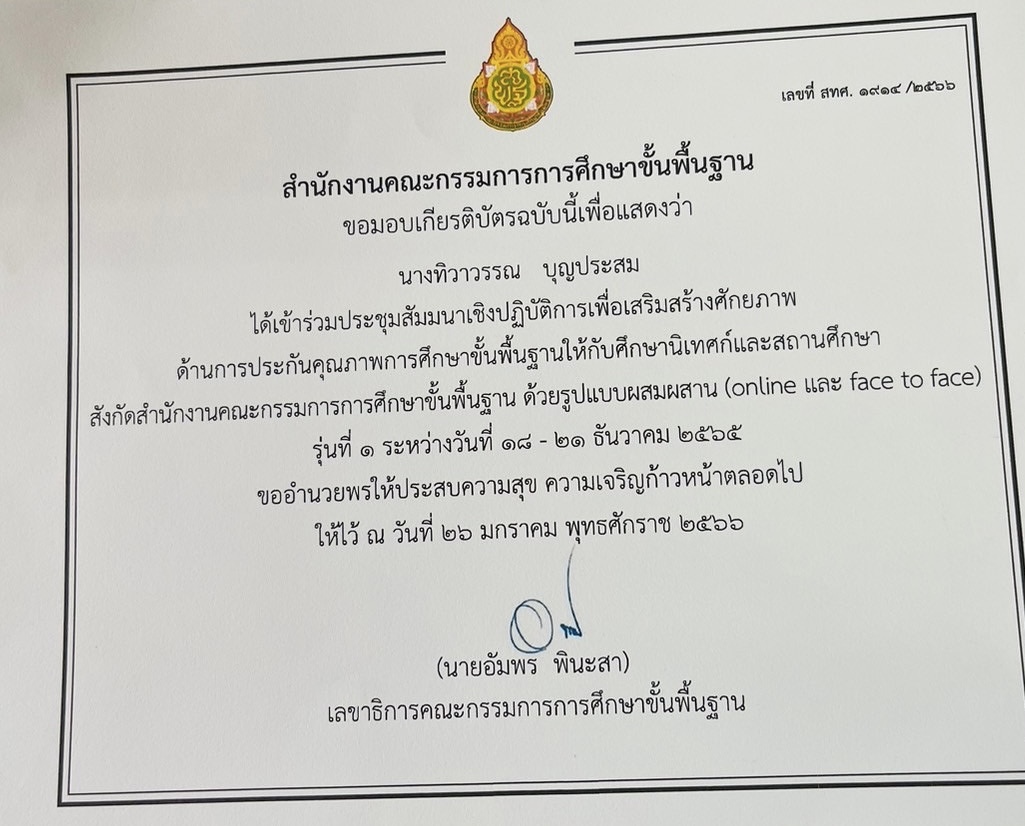 ชื่อผลงาน : ได้เข้าร่วมประชุมสัมมนาเชิงปฏิบัติการเพื่อการเสริมสร้างศักยภาพด้านการประกันคุณภาพทางการศึกษาขั้นพื้นฐานให้กับการศึกษานิเทศและการสถานศึกษา ด้วยรูปแบบผสมผสาน