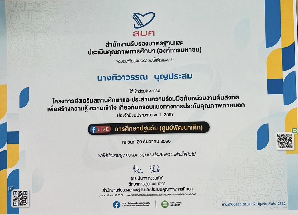 ชื่อผลงาน : โครงการส่งเสริมสถานศึกษาและประสานความร่วมมือกับหน่วยงานต้นสังกัดเพื่อ สร้างความรู้ความเข้าใจเกี่ยวกับกรอบแนวทางการประกันคุณภาพภายนอก