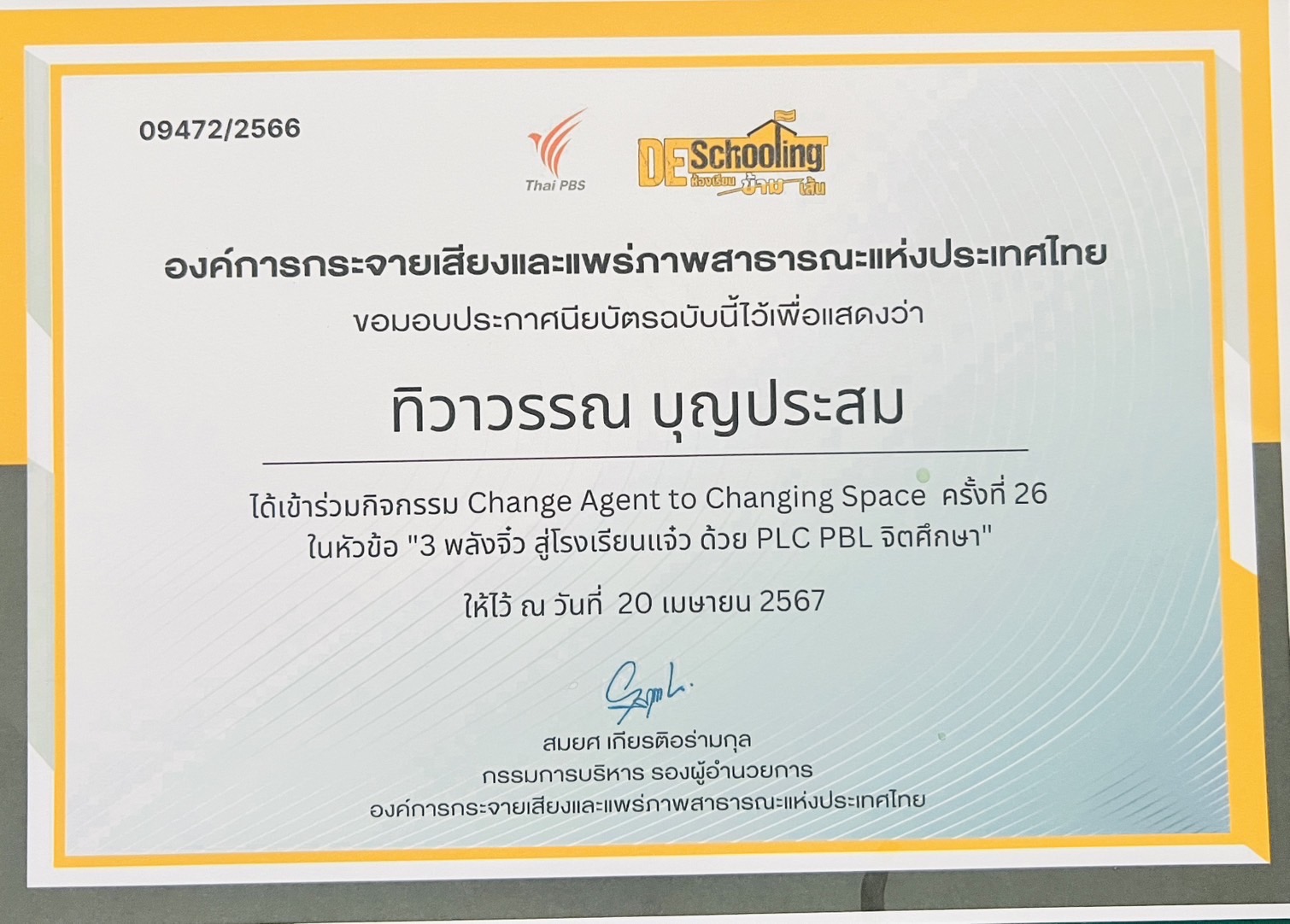 ชื่อผลงาน : ได้เข้าร่วมกิจกรรม Change Agent to Changing Space ครั้งที่ 26 ในหัวข้อ “3 พลังจิ๋ว สู่โรงเรียนแจ๋ว ด้วย PLC PBL จืตศึกษา”