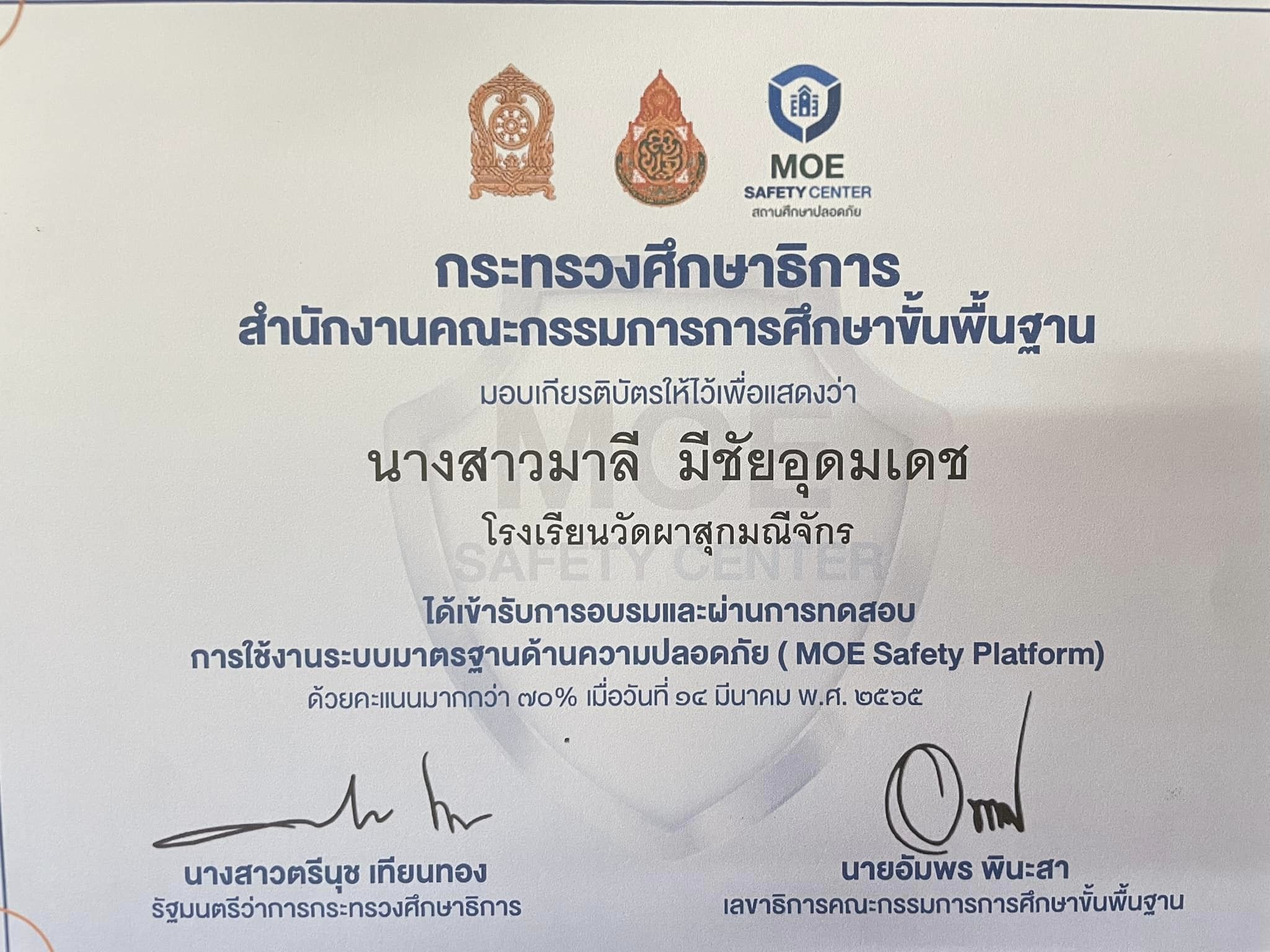 ชื่อผลงาน : การใช้งานระบบมาตรฐานด้านความปลอดภัย (moe safety platform) 14 มี.ค.2565
