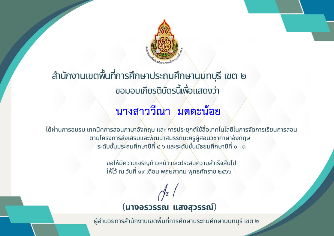 ชื่อผลงาน : อบรมเทคนิคการสอนภาษาอังกฤษ และการประยุกต์ใช้สื่อเทคโนโลยีในการจัดการเรียนการสอนตามโคงการส่งเสริมและพัฒนาสมรรถนะครูผู้สอนวิชาภาษาอังกฤษ