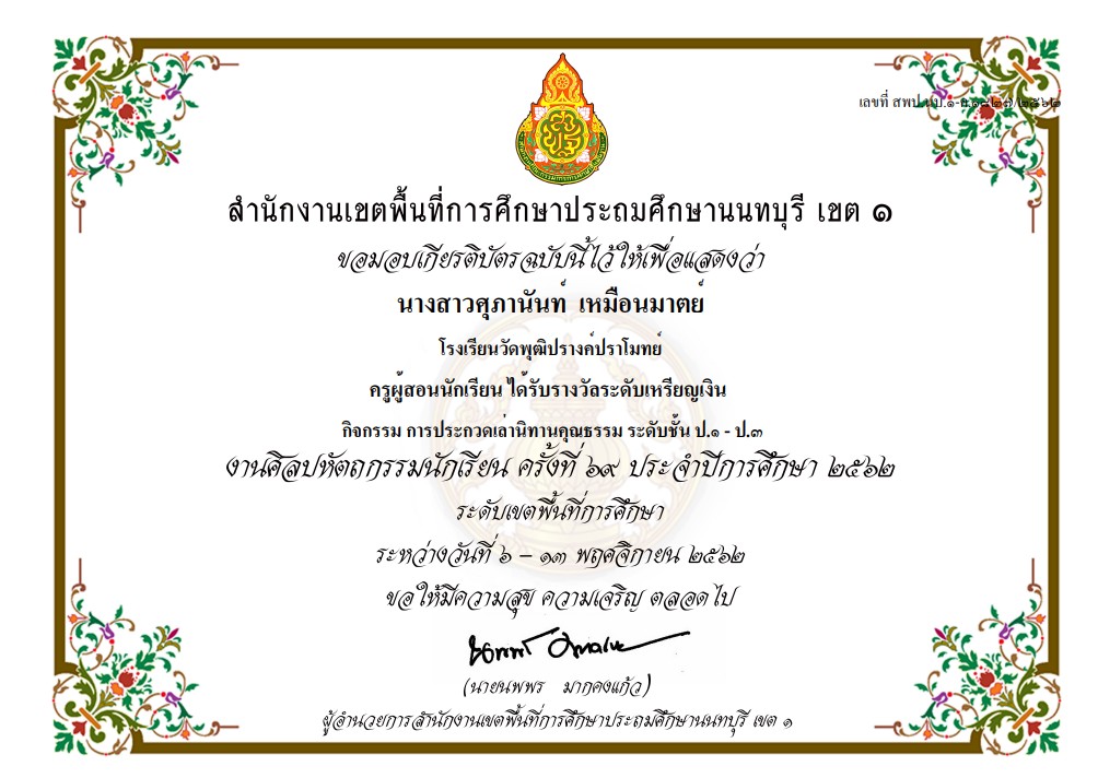 ชื่อผลงาน : ครูผู้สอนนักเรียนได้รับรางวัลระดับเหรัยญเงิน กิจกรรม การประกวดเล่านิทานคุณธรรม ระดับชั้น ป.1-ป.3 งานศิลปหัตถกรรมนักเรียน ครั้งที่ 69 ปีการศึกษา 2562