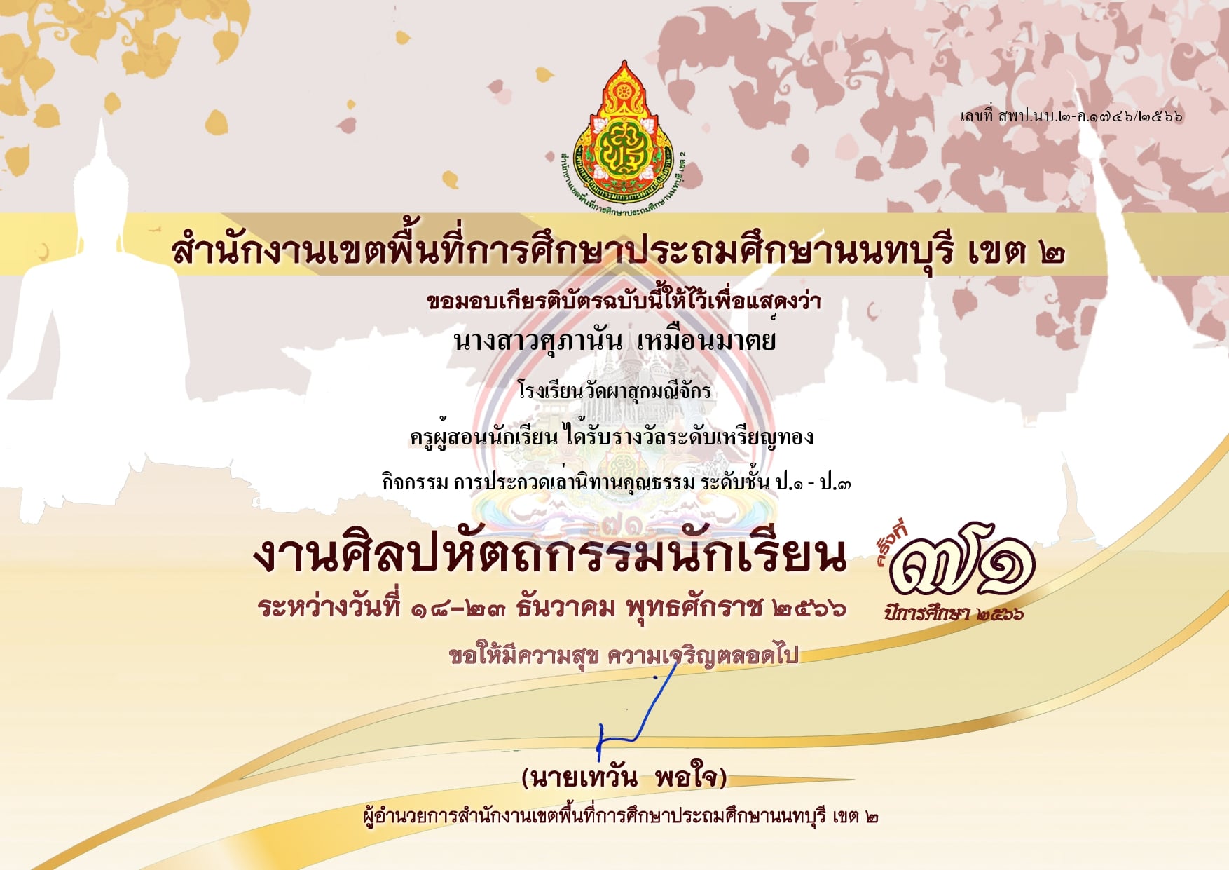 ชื่อผลงาน : ครูผู้สอนนักเรียนได้รับรางวัลระดับเหรียญทอง กิจกรรม การประกวดเล่านิทานคุณธรรม ระดับชั้น ป.1-ป.3 งานศิลปหัตถกรรมนักเรียน ครั้งที่ 71 ปีการศึกษา 2566