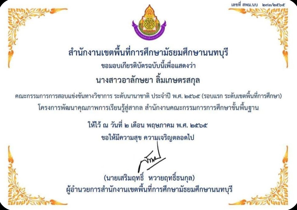ชื่อผลงาน : เกียรติบัตรการปฏิบัติหน้าที่กรรมการการสอบแข่งขันวิชาการ ระดับนานาชาติ