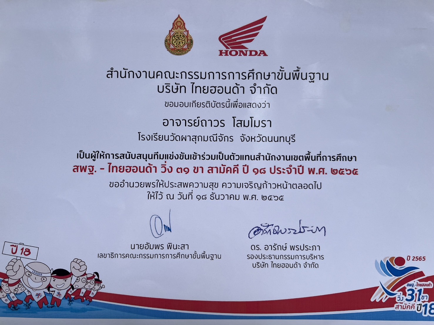 ชื่อผลงาน : เป็นผู้ให้การสนับสนุนทีมแข่งข้นเข้าร่วมเป็นตัวแทนสำนักงานเขตพื้นที่การศึกษา สพฐ. - ไทยฮอนด้า วิ่ง ๓๑ ขา สามัคคี ปี ๑๔ ประจำปี พ.ศ. ๒๕๖๕