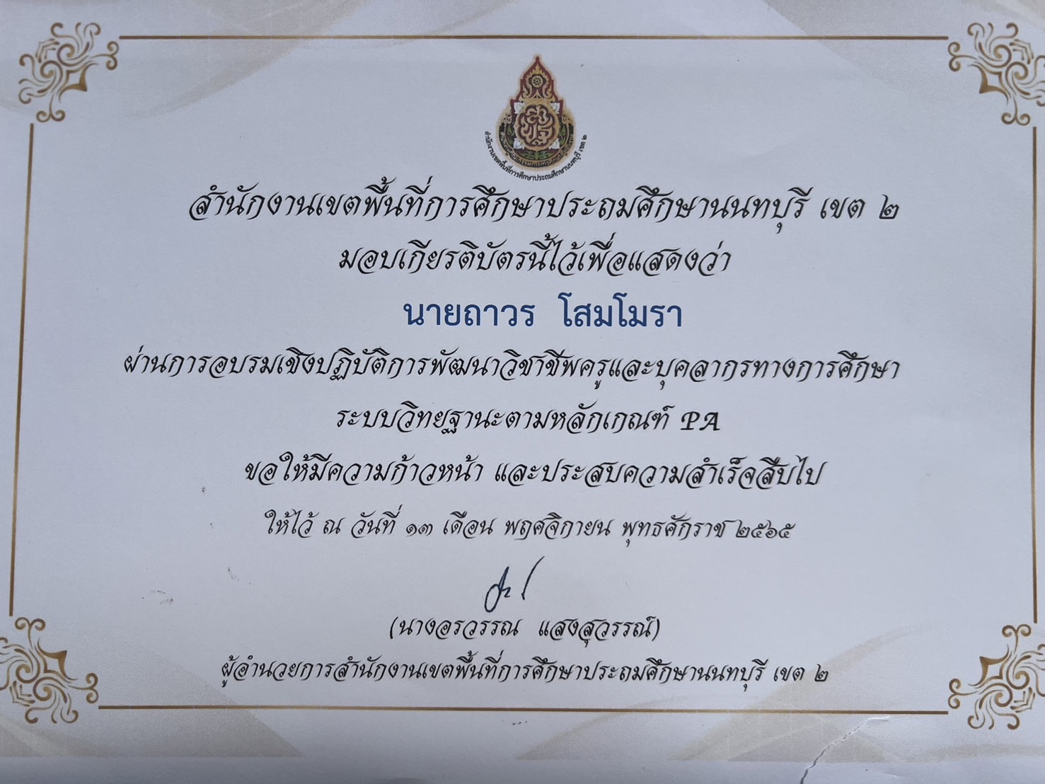 ชื่อผลงาน : ผ่านการอบรมเขิงปฏิบัติการพัฒนาวิชาชีพครุและบุคลากรทางการศึกษา ระบบวิทยฐานะตามหลักเกณต์ 22