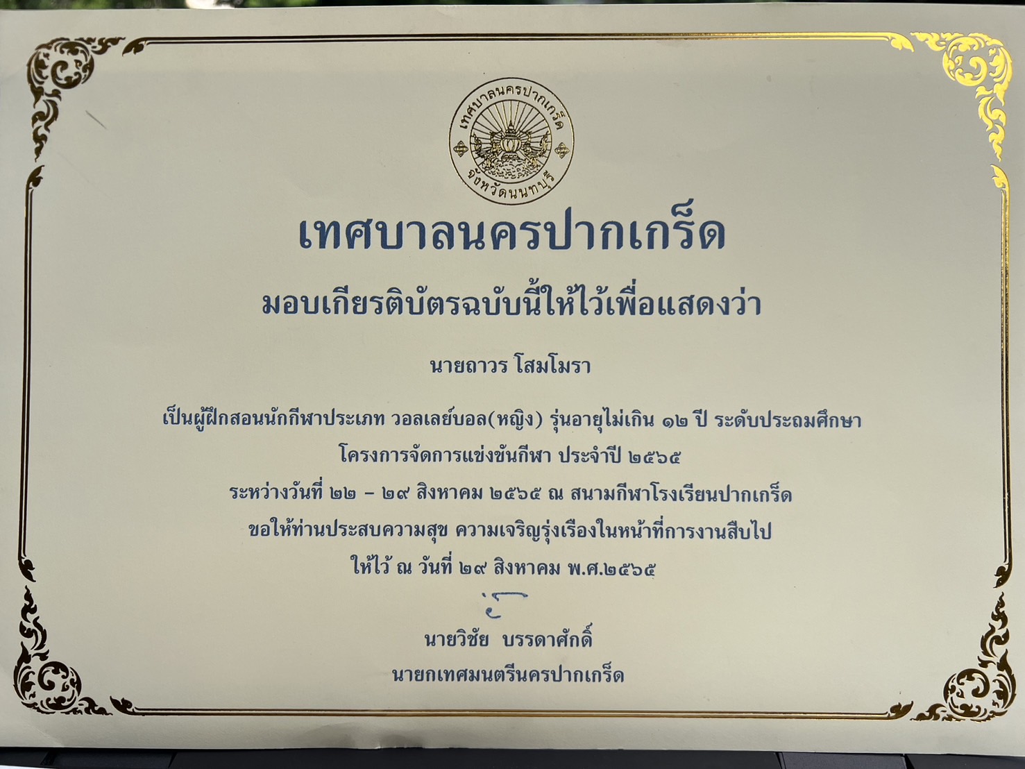 ชื่อผลงาน : เป็นผู้ฝึกสอนนักกีฬาประเภท วอลเลย์บอล(หญิง) รุ่นอายุไม่เกิน ๑๒ ปี ระดับประถมศึกษา โครงการจัดการแข่งขันกีฬา ประจำปี ๒๕๖๕ ระหว่างวันที่ ๒๒ - ๒๙ สิงหาคม ๒๕'๖๕ ณ สนามกีพาโรงเรียนปากเกร็ด