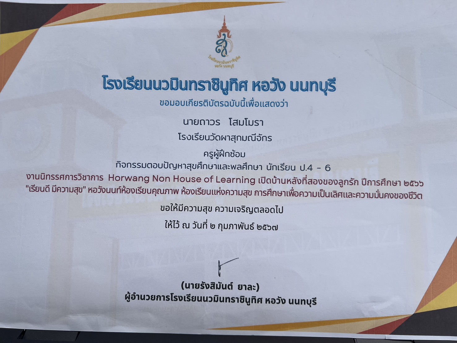 ชื่อผลงาน : ครูผู้ฝึกซ้อม กิจกรรมตอบปัญหาสุขศึกษาและพลศึกษา นักเรียน ป.4 - 6 งานนิทรรศการวิชาการ Horwang Non House of Learning เปิดบ้านหลังที่สองของลูกรัก ปีการศึกษา ๒๕๖๖ นดี มีความสุข" หอวังนนท์ห้องเรียนคุณภาพ ห้องเรียนแห่งความสุข การศึกษาเพื่อความเป็นเลิศ