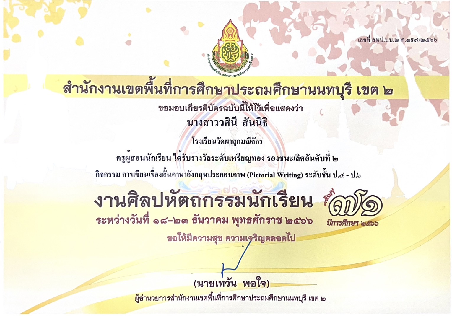 ชื่อผลงาน : ครูผู้สอนนักเรียนได้รับรางวัลระดับเหรียญทองรองชนะเลิศอันดับที่สองกิจกรรมการเขียนเรื่องสั้นภาษาอังกฤษประกอบภาพ (Pictorial Writing) ระดับชั้น ป.4 - ป.6