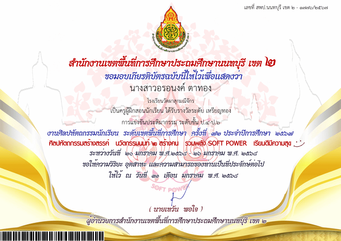 ชื่อผลงาน : ครูผู้สอนนักเรียนได้รับรางวัลระดับเหรียญทอง กิจกรรมประติมากรรม ระดับชั้น ป.4- ป.6 งานศิลปหัตถกรรมนักเรียน ครั้งที่ 72 ปีการศึกษา 2567